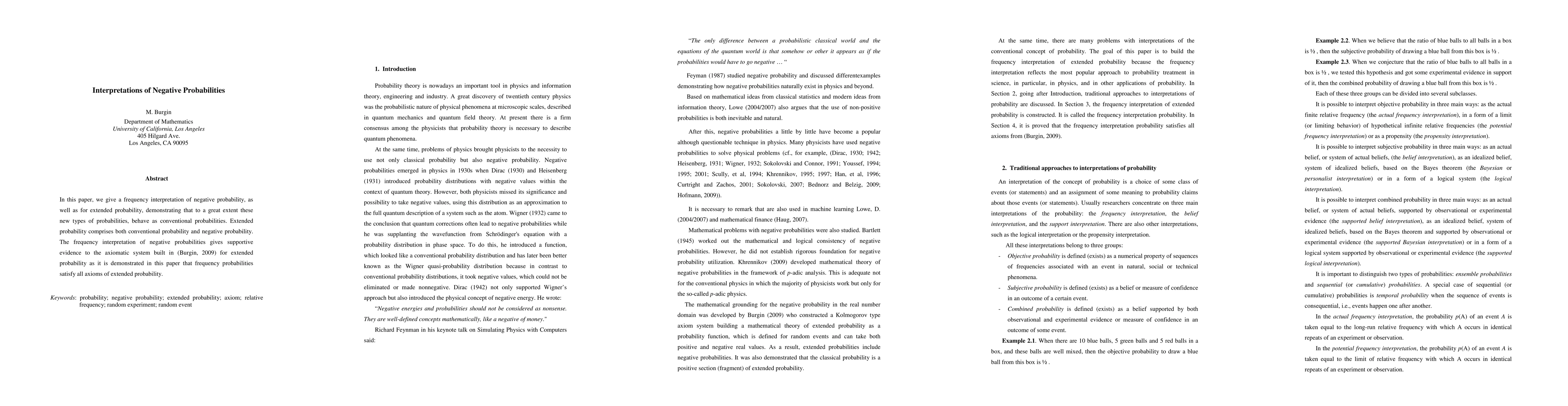 This paper proposes a frequency interpretation for negative and extended probabilities, showing they behave similarly to conventional probabilities, and confirms the axiomatic framework for extended probability introduced in Burgin (2009).