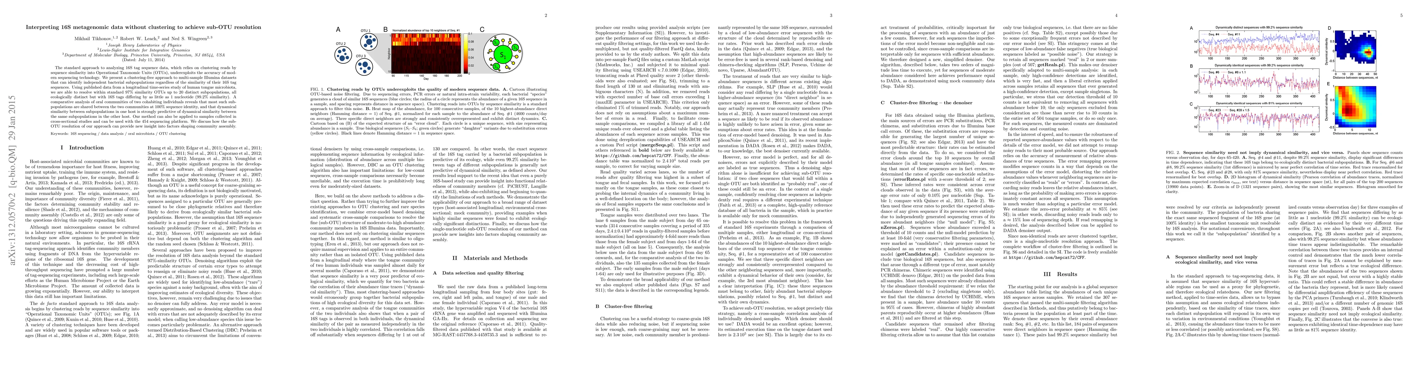The standard approach to analyzing 16S tag sequence data, which relies on clustering reads by sequence similarity into Operational Taxonomic Units (OTUs), underexploits the accuracy of modern sequencing technology. We present a clustering-free approach to multi-sample Illumina datasets that can identify independent bacterial subpopulations regardless of the similarity of their 16S tag sequences. Using published data from a longitudinal time-series study of human tongue microbiota, we are able to resolve within standard 97% similarity OTUs up to 20 distinct subpopulations, all ecologically distinct but with 16S tags differing by as little as 1 nucleotide (99.2% similarity). A comparative analysis of oral communities of two cohabiting individuals reveals that most such subpopulations are shared between the two communities at 100% sequence identity, and that dynamical similarity between subpopulations in one host is strongly predictive of dynamical similarity between the same subpopulations in the other host. Our method can also be applied to samples collected in cross-sectional studies and can be used with the 454 sequencing platform. We discuss how the sub-OTU resolution of our approach can provide new insight into factors shaping community assembly.