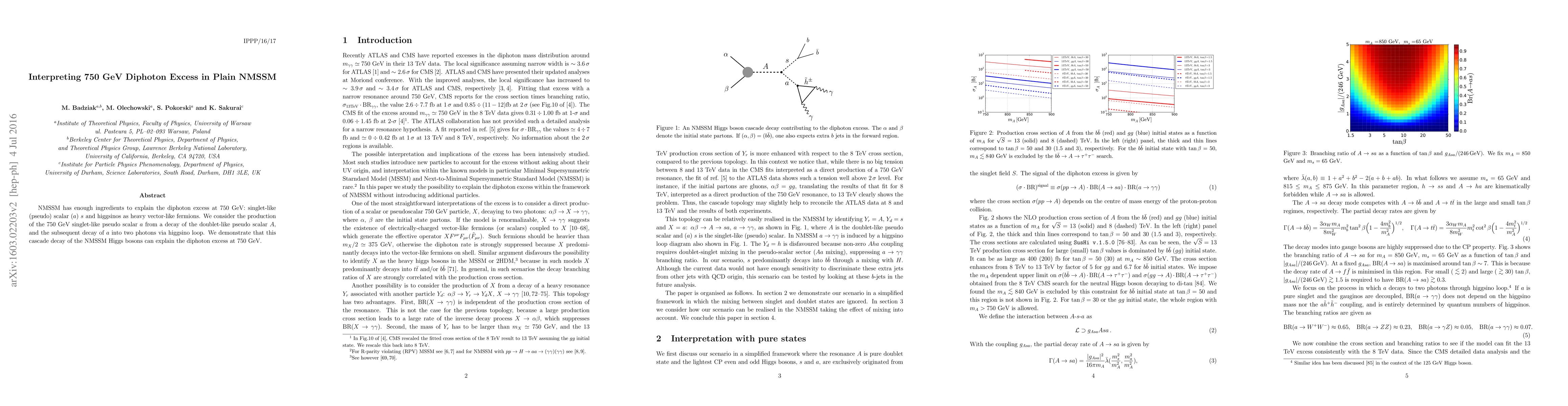 The paper proposes that the NMSSM can explain the 750 GeV diphoton excess via a cascade decay process where a singlet-like pseudo scalar ($a$) decays into two photons through higgsino mediation, consistent with observed data from 13 TeV but not 8 TeV collisions.