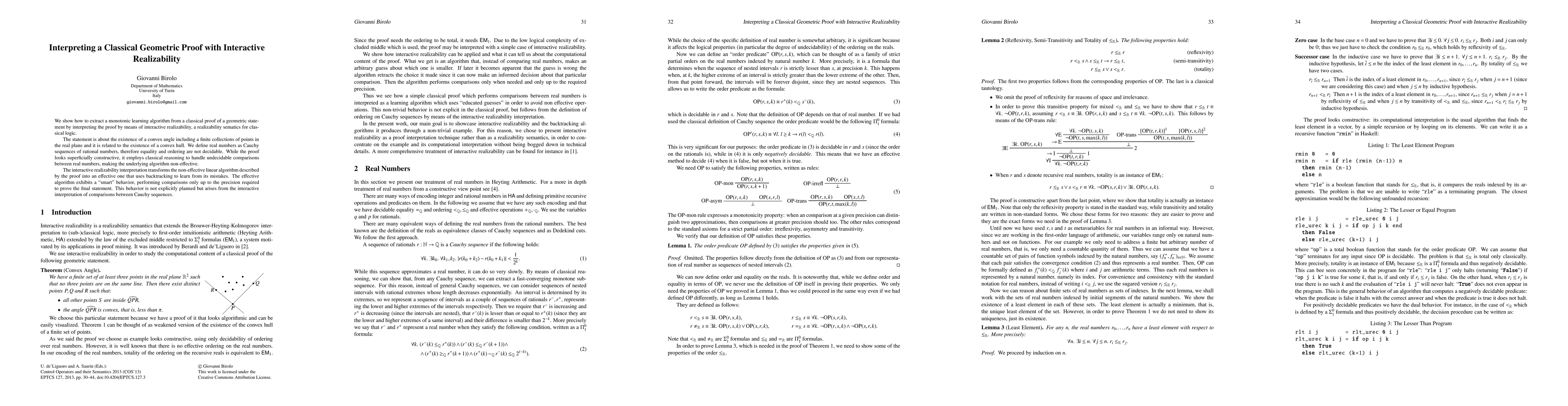 We show how to extract a monotonic learning algorithm from a classical proof of a geometric statement by interpreting the proof by means of interactive realizability, a realizability sematics for classical logic. The statement is about the existence of a convex angle including a finite collections of points in the real plane and it is related to the existence of a convex hull. We define real numbers as Cauchy sequences of rational numbers, therefore equality and ordering are not decidable. While the proof looks superficially constructive, it employs classical reasoning to handle undecidable comparisons between real numbers, making the underlying algorithm non-effective. The interactive realizability interpretation transforms the non-effective linear algorithm described by the proof into an effective one that uses backtracking to learn from its mistakes. The effective algorithm exhibits a "smart" behavior, performing comparisons only up to the precision required to prove the final statement. This behavior is not explicitly planned but arises from the interactive interpretation of comparisons between Cauchy sequences.