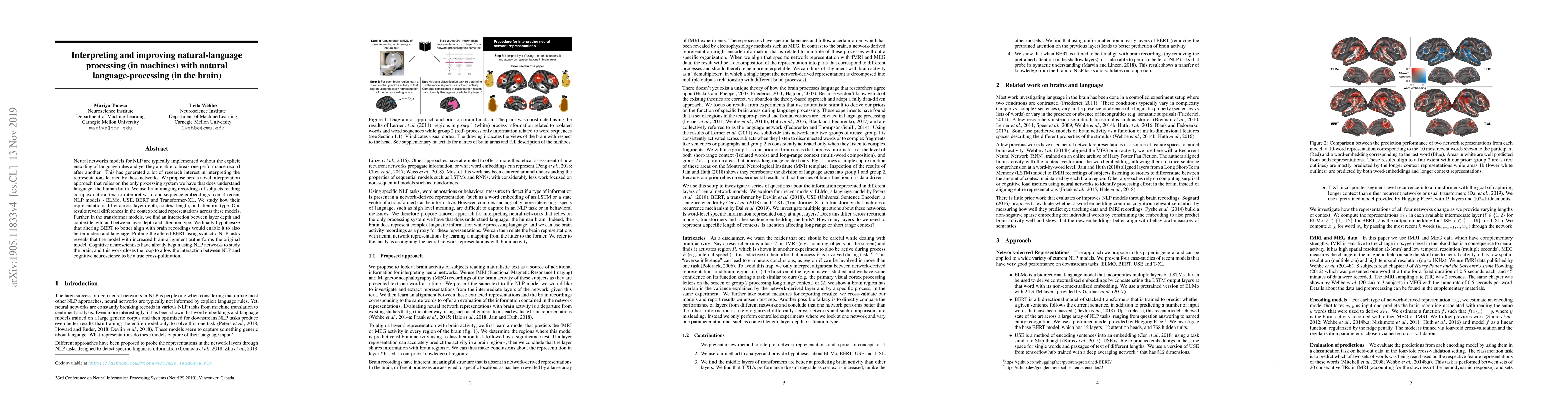 Neural networks models for NLP are typically implemented without the explicit encoding of language rules and yet they are able to break one performance record after another. This has generated a lot of research interest in interpreting the representations learned by these networks. We propose here a novel interpretation approach that relies on the only processing system we have that does understand language: the human brain. We use brain imaging recordings of subjects reading complex natural text to interpret word and sequence embeddings from 4 recent NLP models - ELMo, USE, BERT and Transformer-XL. We study how their representations differ across layer depth, context length, and attention type. Our results reveal differences in the context-related representations across these models. Further, in the transformer models, we find an interaction between layer depth and context length, and between layer depth and attention type. We finally hypothesize that altering BERT to better align with brain recordings would enable it to also better understand language. Probing the altered BERT using syntactic NLP tasks reveals that the model with increased brain-alignment outperforms the original model. Cognitive neuroscientists have already begun using NLP networks to study the brain, and this work closes the loop to allow the interaction between NLP and cognitive neuroscience to be a true cross-pollination.