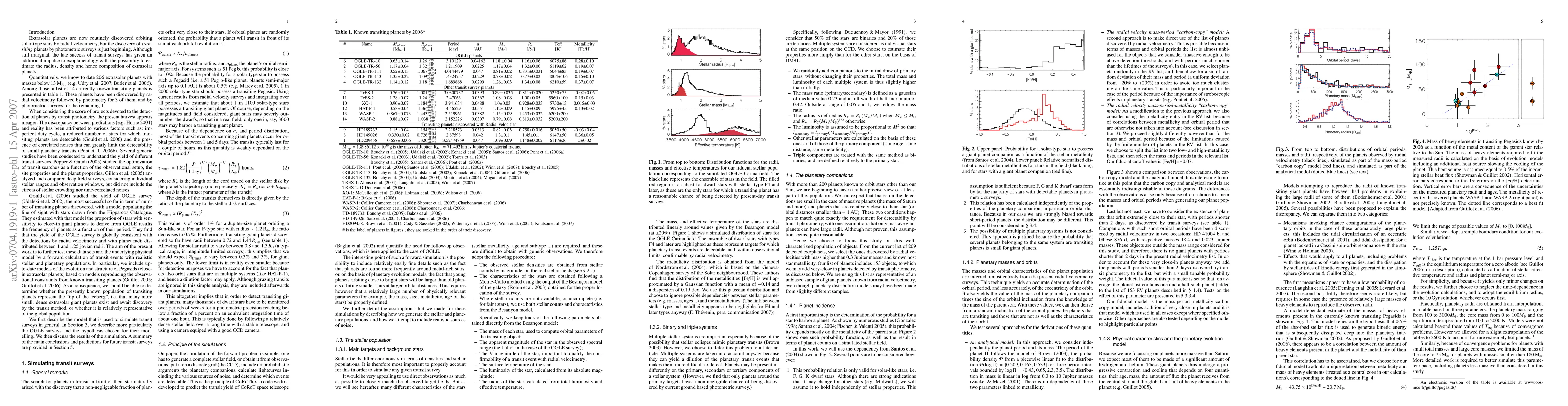 Transiting extrasolar planets are now discovered jointly by photometric surveys and by radial velocimetry. We want to determine whether the different data sets are compatible between themselves and with models of the evolution of extrasolar planets. We simulate directly a population of stars corresponding to the OGLE transit survey and assign them planetary companions based on radial velocimetry discoveries. We use a model of the evolution and structure of giant planets assuming a variable fraction of heavy elements. The output list of detectable planets of the simulations is compared to the real detections. We confirm that the radial velocimetry and photometric survey data sets are compatible within the statistical errors, assuming that planets with periods between 1 and 2 days are approximately 5 times less frequent than planets with periods between 2 and 5 days. We show that evolution models fitting present observational constraints predict a lack of small giant planets with large masses. We also identify distinct populations of planets: those with short periods (P < 10d) are only found in orbit around metal-rich stars with [Fe/H] > -0.07. We further confirm the relative absence of low-mass giant planets at small orbital distances.