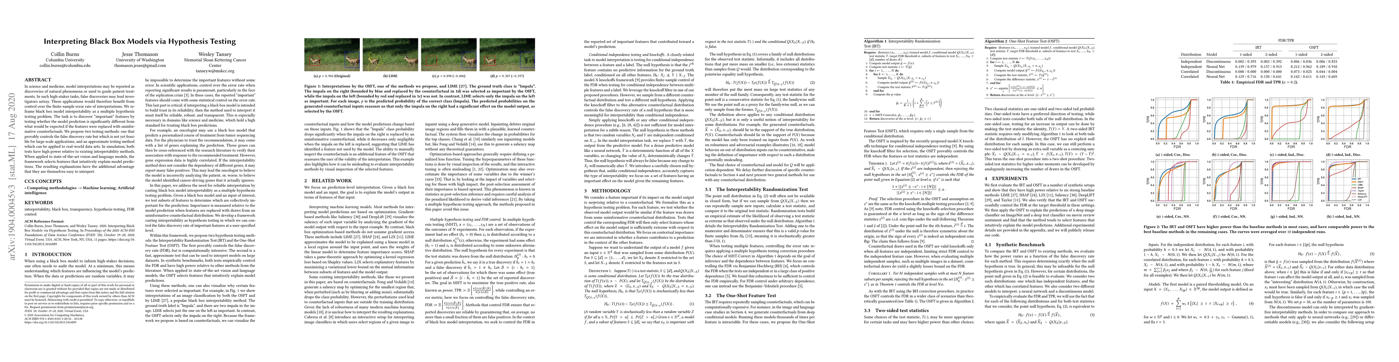 This paper proposes a framework for interpreting black box models by framing the task as a multiple hypothesis testing problem, introducing two testing methods to identify significant features. The methods aim to control the false discovery rate, with one being theoretically sound but impractical for large datasets, and the other being an approximate method suitable for real-world applications.