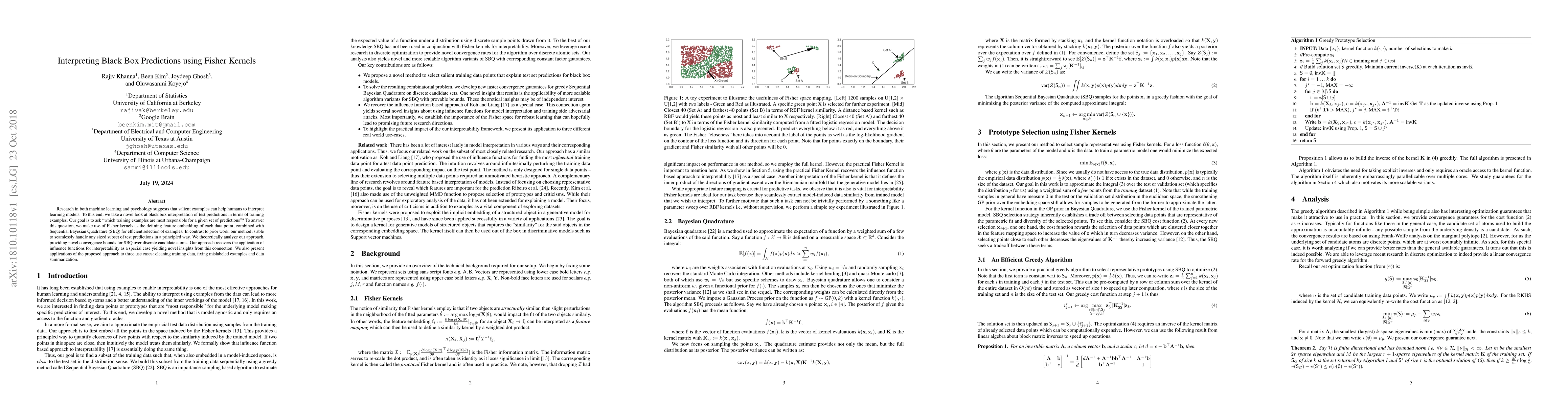 Research in both machine learning and psychology suggests that salient examples can help humans to interpret learning models. To this end, we take a novel look at black box interpretation of test predictions in terms of training examples. Our goal is to ask `which training examples are most responsible for a given set of predictions'? To answer this question, we make use of Fisher kernels as the defining feature embedding of each data point, combined with Sequential Bayesian Quadrature (SBQ) for efficient selection of examples. In contrast to prior work, our method is able to seamlessly handle any sized subset of test predictions in a principled way. We theoretically analyze our approach, providing novel convergence bounds for SBQ over discrete candidate atoms. Our approach recovers the application of influence functions for interpretability as a special case yielding novel insights from this connection. We also present applications of the proposed approach to three use cases: cleaning training data, fixing mislabeled examples and data summarization.