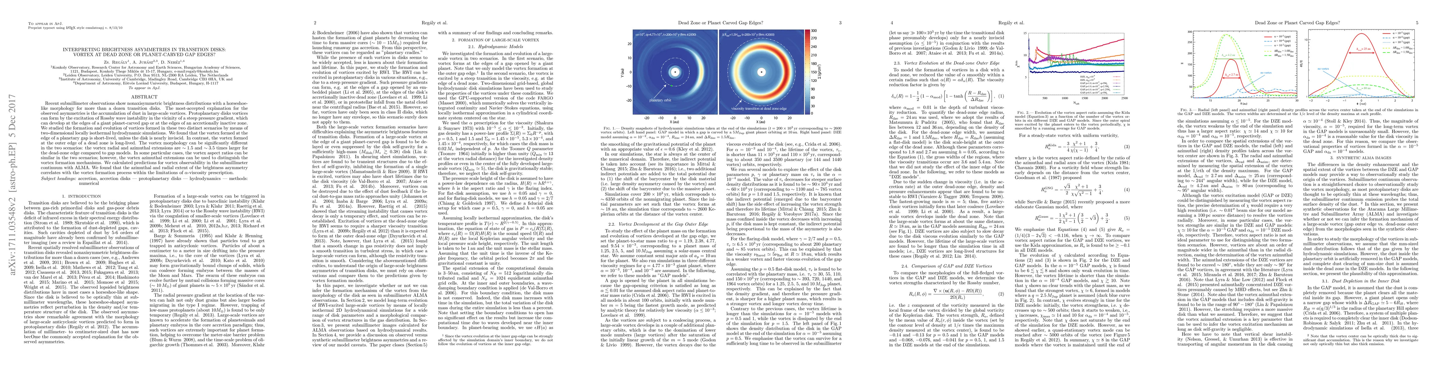 This paper investigates the origins of brightness asymmetries in transition disks, proposing that these asymmetries could be due to vortices formed either at the edge of a planet-carved gap or at the edge of an accretionally inactive dead zone. Simulations show that vortices at dead zone edges are long-lived and larger, while those at gap edges are short-lived unless the disk is nearly inviscid, providing a method to distinguish between the two formation scenarios based on vortex morphology.