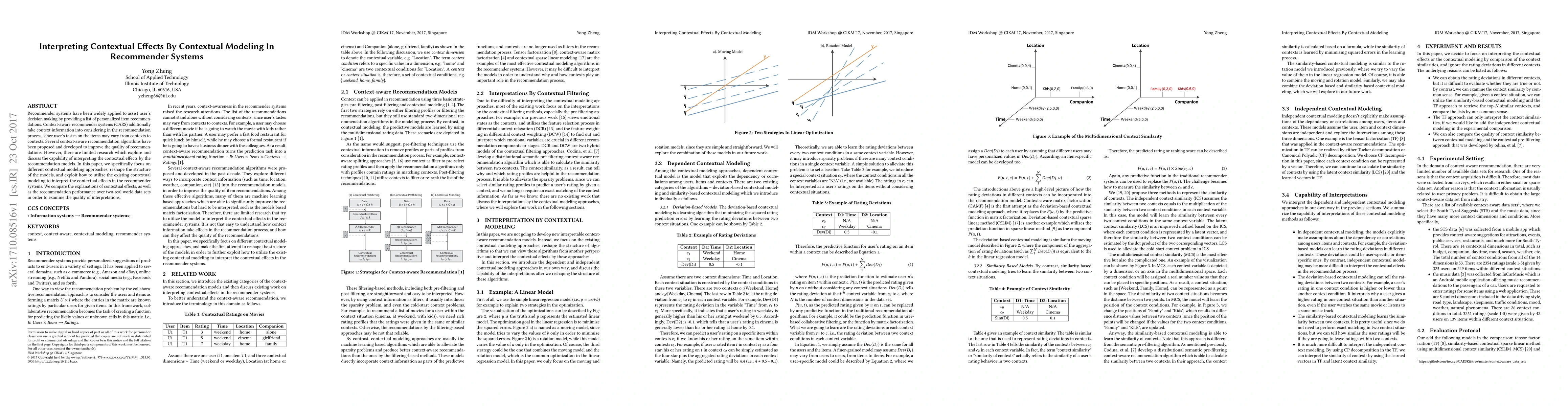 The paper focuses on interpreting contextual effects in recommender systems by reshaping the structure of existing contextual modeling approaches, comparing their interpretations and recommendation performance over two real-world datasets.