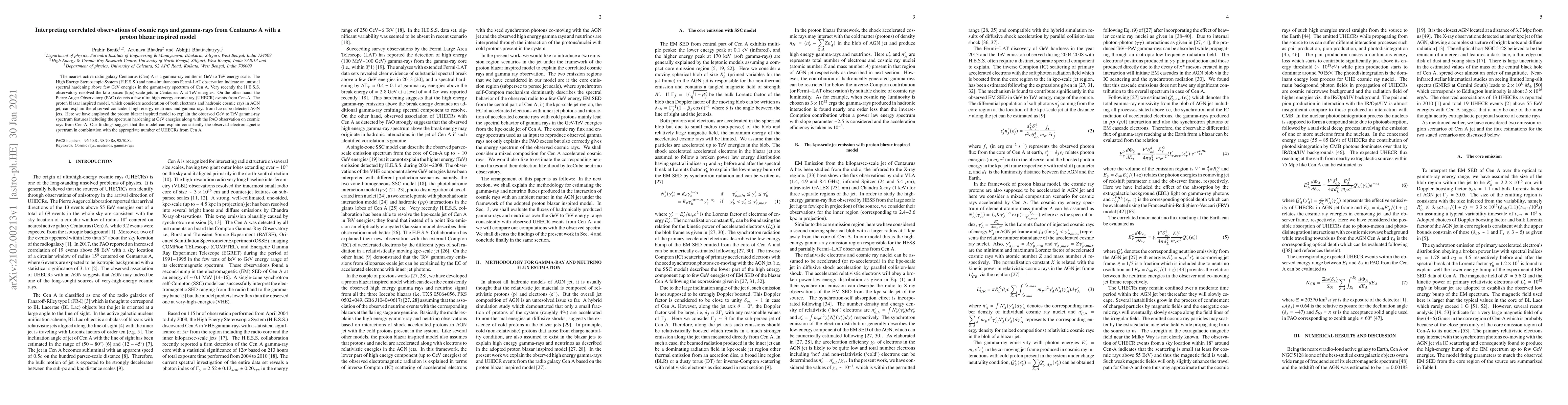 This paper uses a proton blazar inspired model to explain the correlated observations of gamma-rays and cosmic rays from Centaurus A, showing that the model can consistently account for the observed spectral hardening in gamma-rays and the ultra-high energy cosmic rays detected by the Pierre Auger Observatory.