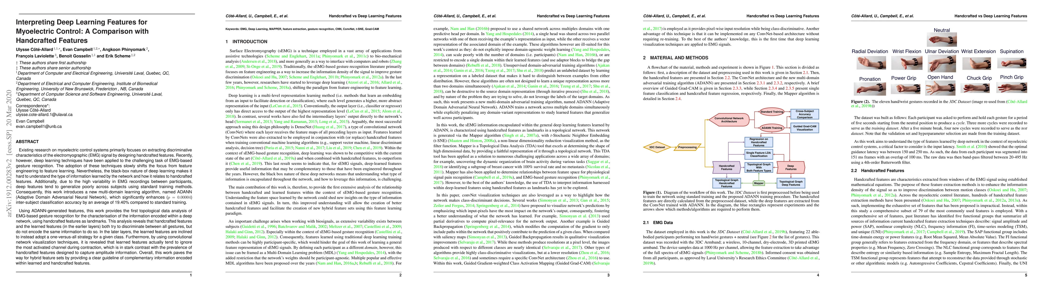 This paper compares deep learning features with handcrafted features in myoelectric control systems, revealing that while both aim to discriminate gestures, they encode different information. The study introduces ADANN to improve inter-subject classification accuracy, and through topological data analysis and visualization techniques, it demonstrates that deep features often overlook key channels emphasized by handcrafted features.