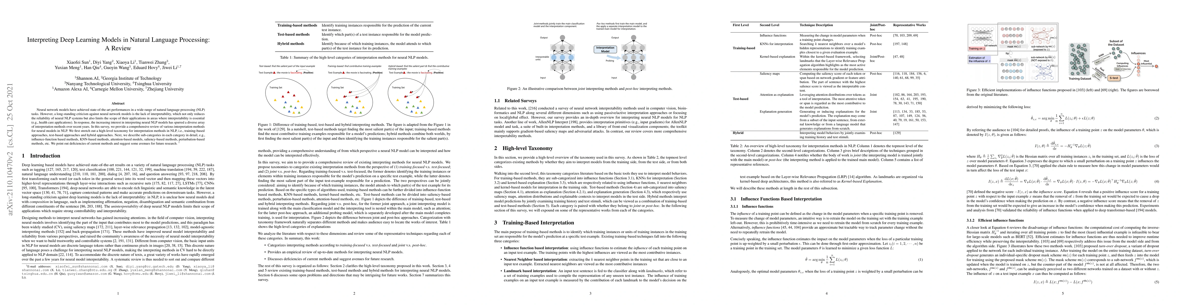 The paper provides a comprehensive review of interpretation methods for neural models in NLP, categorizing them into training-based, test-based, and hybrid approaches with sub-categories like influence-function based methods, KNN-based methods, attention-based models, saliency-based methods, and perturbation-based methods.