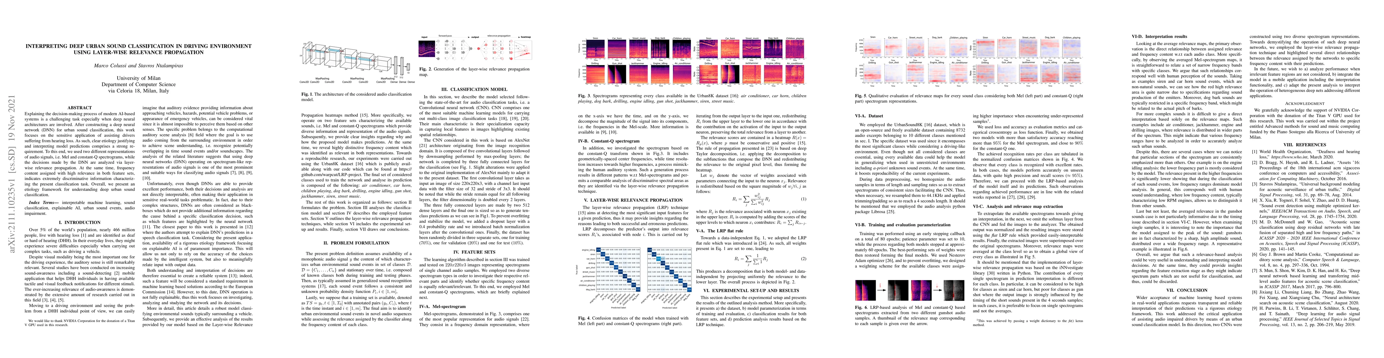 This paper develops a deep neural network for classifying urban sounds and employs layer-wise relevance propagation to interpret its predictions, aiming to assist drivers with hearing loss. It uses Mel and constant-Q spectrograms to represent audio signals, highlighting discriminative features for better understanding.