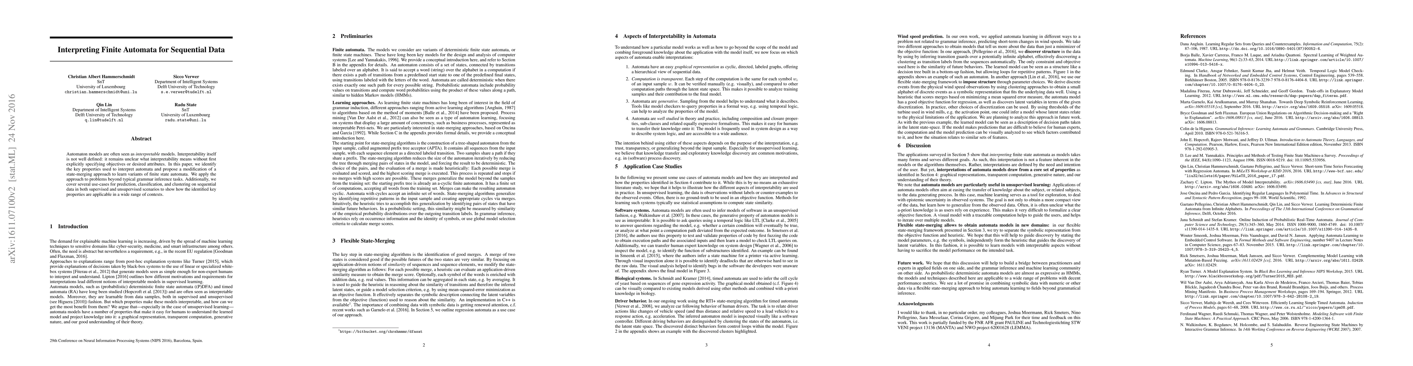 Automaton models are often seen as interpretable models. Interpretability itself is not well defined: it remains unclear what interpretability means without first explicitly specifying objectives or desired attributes. In this paper, we identify the key properties used to interpret automata and propose a modification of a state-merging approach to learn variants of finite state automata. We apply the approach to problems beyond typical grammar inference tasks. Additionally, we cover several use-cases for prediction, classification, and clustering on sequential data in both supervised and unsupervised scenarios to show how the identified key properties are applicable in a wide range of contexts.