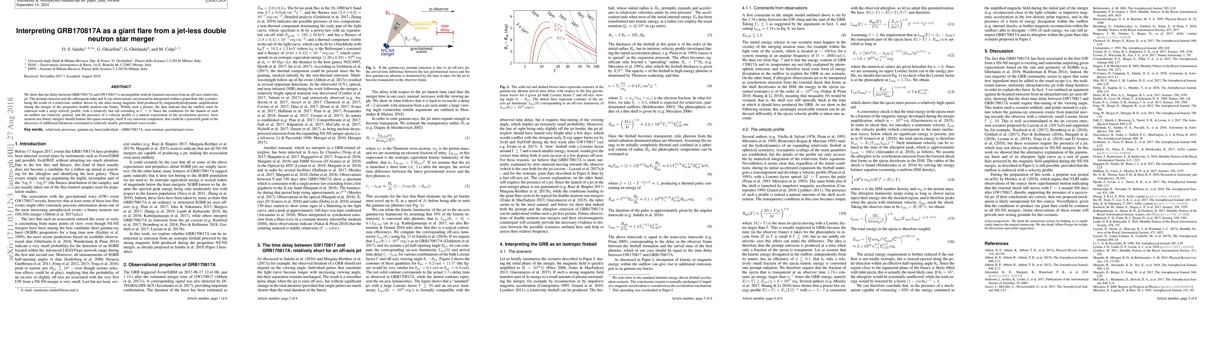 A recent study reinterprets GRB170817A as a giant flare from a jet-less double neutron-star merger, instead of de-beamed emission from an off-axis relativistic jet. The outflow is driven by the ultra-strong magnetic field produced during the merger, with a steep velocity profile that could be present in most neutron star binary mergers.
