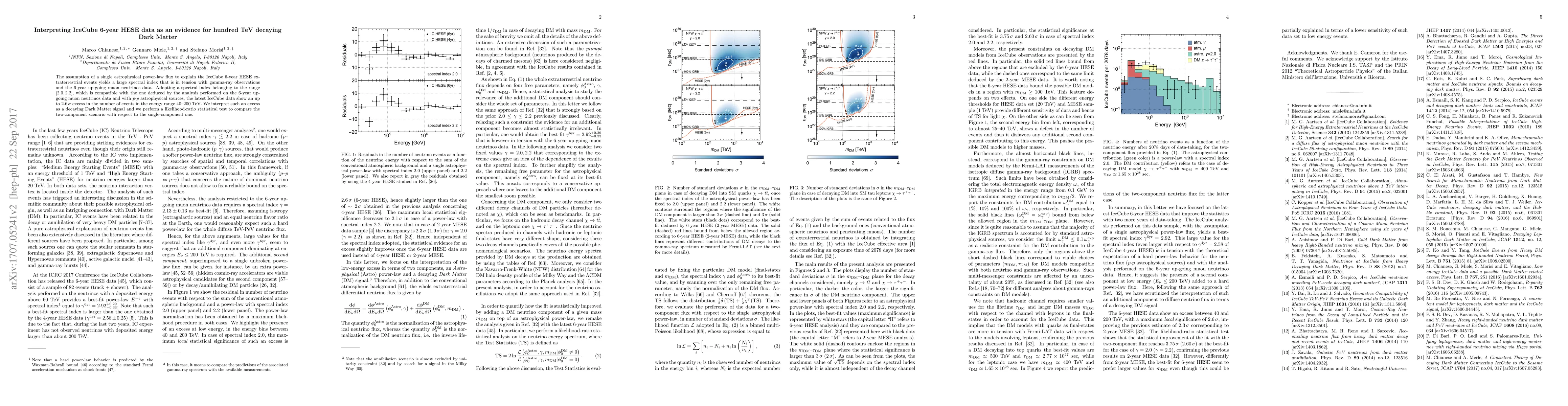 The research suggests an anomaly in IceCube 6-year HESE extraterrestrial neutrino data, indicating a spectral index incompatible with astrophysical models. This discrepancy, falling in the 40-200 TeV range, is proposed as potential evidence for decaying Dark Matter, supported by a statistical test favoring a two-component over a single-component model.