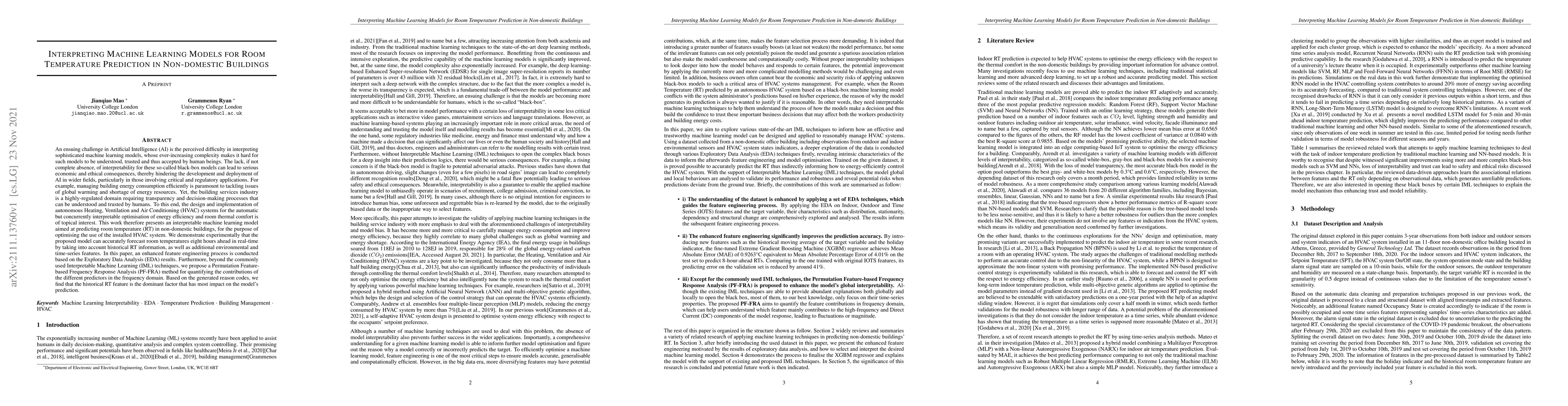 An ensuing challenge in Artificial Intelligence (AI) is the perceived difficulty in interpreting sophisticated machine learning models, whose ever-increasing complexity makes it hard for such models to be understood, trusted and thus accepted by human beings. The lack, if not complete absence, of interpretability for these so-called black-box models can lead to serious economic and ethical consequences, thereby hindering the development and deployment of AI in wider fields, particularly in those involving critical and regulatory applications. Yet, the building services industry is a highly-regulated domain requiring transparency and decision-making processes that can be understood and trusted by humans. To this end, the design and implementation of autonomous Heating, Ventilation and Air Conditioning systems for the automatic but concurrently interpretable optimisation of energy efficiency and room thermal comfort is of topical interest. This work therefore presents an interpretable machine learning model aimed at predicting room temperature in non-domestic buildings, for the purpose of optimising the use of the installed HVAC system. We demonstrate experimentally that the proposed model can accurately forecast room temperatures eight hours ahead in real-time by taking into account historical RT information, as well as additional environmental and time-series features. In this paper, an enhanced feature engineering process is conducted based on the Exploratory Data Analysis results. Furthermore, beyond the commonly used Interpretable Machine Learning techniques, we propose a Permutation Feature-based Frequency Response Analysis (PF-FRA) method for quantifying the contributions of the different predictors in the frequency domain. Based on the generated reason codes, we find that the historical RT feature is the dominant factor that has most impact on the model prediction.