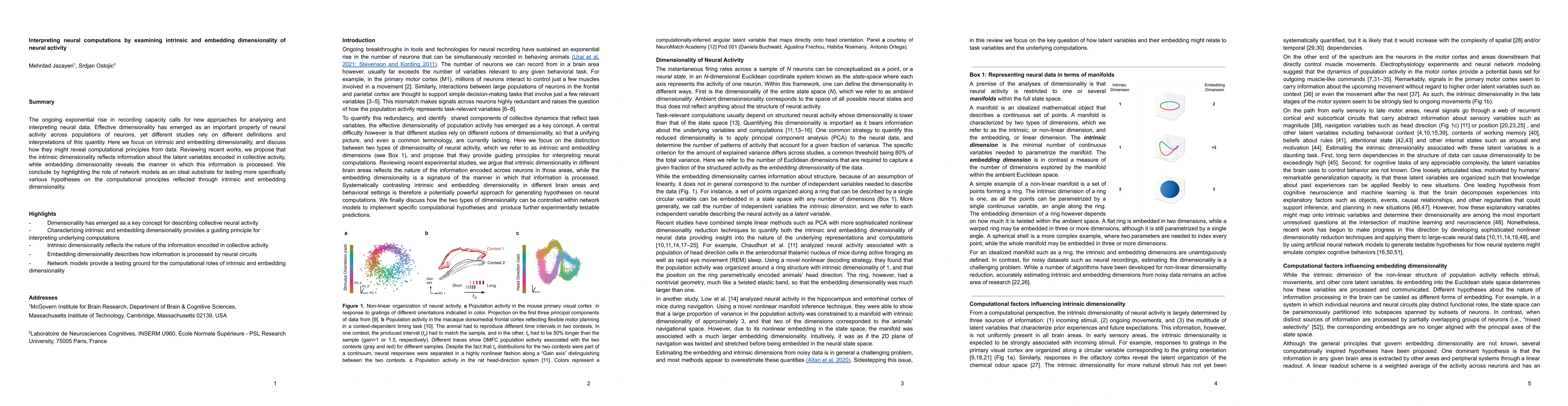 This paper explores the concepts of intrinsic and embedding dimensionality in neural activity to interpret neural computations. It argues that intrinsic dimensionality reveals latent variables encoded in neural data, while embedding dimensionality shows how information is processed, suggesting network models as a tool to test hypotheses on computational principles.