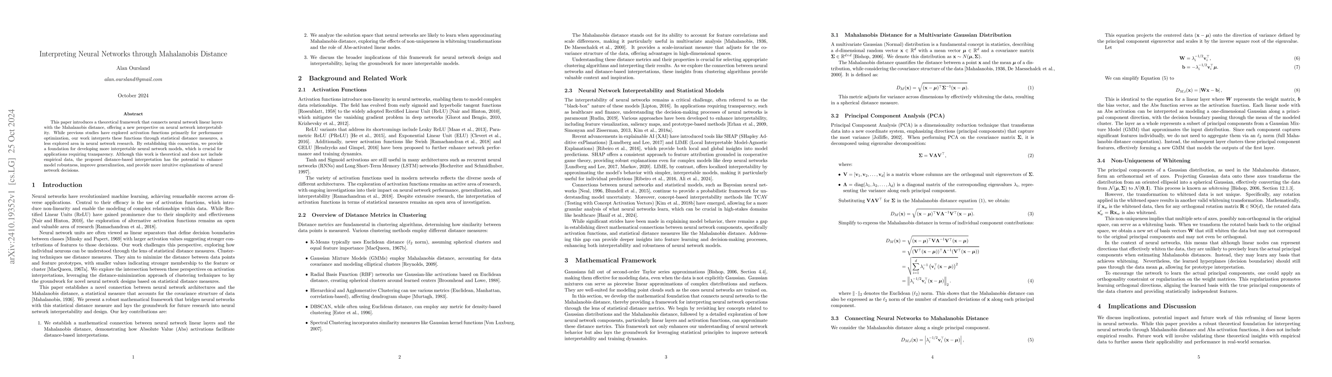 This paper proposes a theoretical framework linking neural network linear layers with Mahalanobis distance to offer new interpretability insights. The connection between activation functions and statistical distance measures aims to develop more transparent neural network models, potentially improving robustness and generalization.