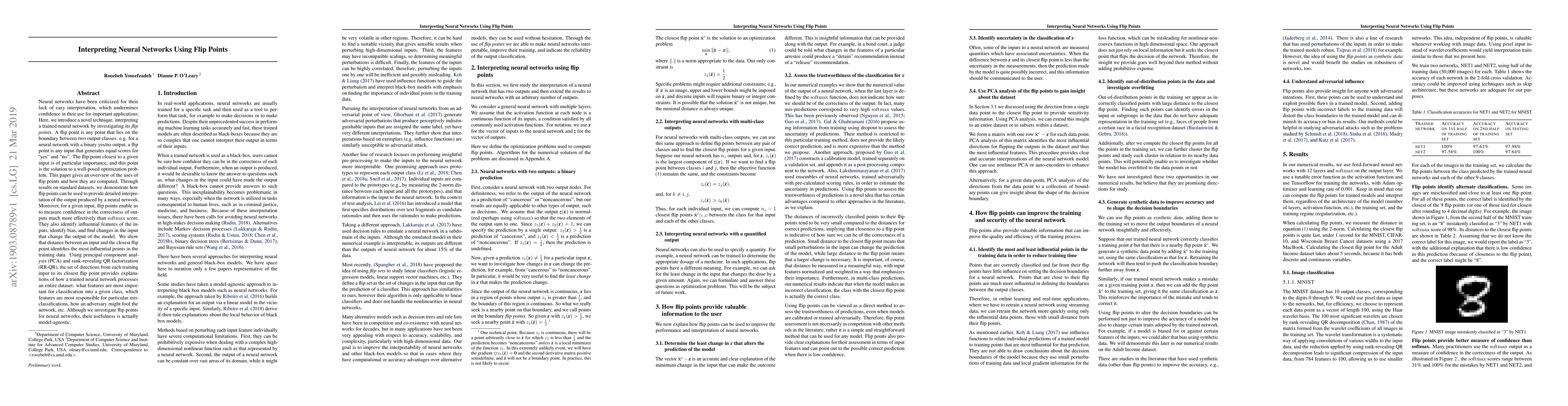 This paper introduces a novel technique to interpret neural networks by investigating flip points, which are inputs that generate equal scores for different output classes. The method provides detailed insights into neural network decisions, measures output confidence, identifies influential features, and reveals biases, demonstrating its model-agnostic utility through standard dataset analyses.
