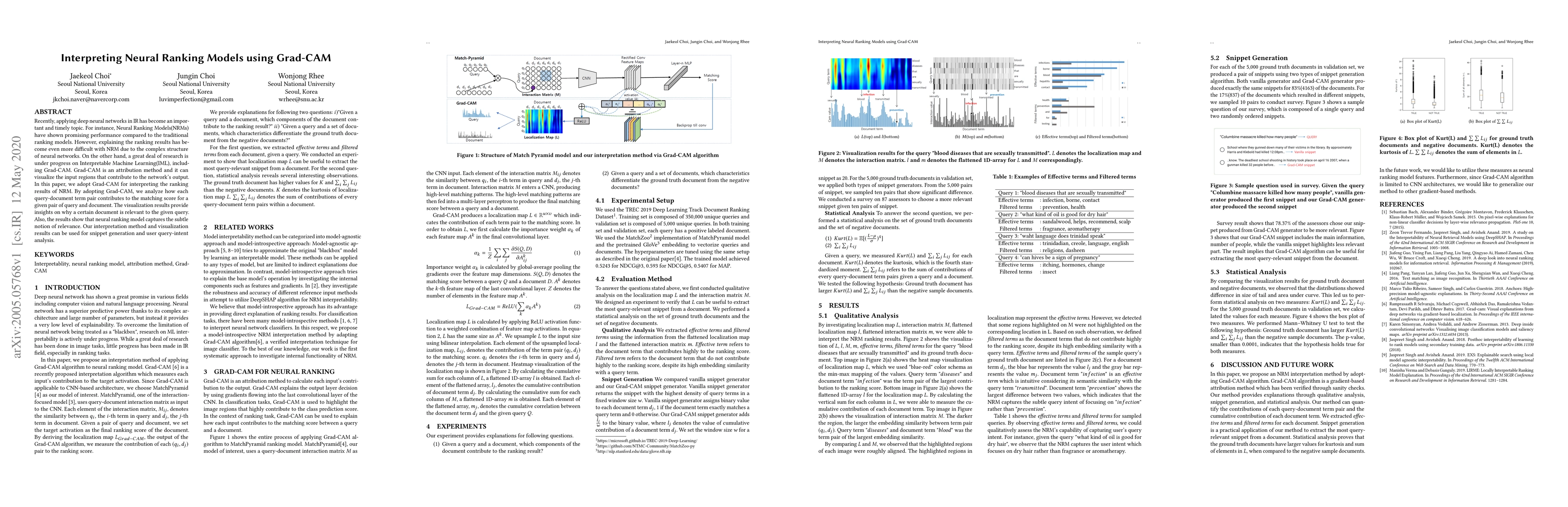 Recently, applying deep neural networks in IR has become an important and timely topic. For instance, Neural Ranking Models(NRMs) have shown promising performance compared to the traditional ranking models. However, explaining the ranking results has become even more difficult with NRM due to the complex structure of neural networks. On the other hand, a great deal of research is under progress on Interpretable Machine Learning(IML), including Grad-CAM. Grad-CAM is an attribution method and it can visualize the input regions that contribute to the network's output. In this paper, we adopt Grad-CAM for interpreting the ranking results of NRM. By adopting Grad-CAM, we analyze how each query-document term pair contributes to the matching score for a given pair of query and document. The visualization results provide insights on why a certain document is relevant to the given query. Also, the results show that neural ranking model captures the subtle notion of relevance. Our interpretation method and visualization results can be used for snippet generation and user-query intent analysis.