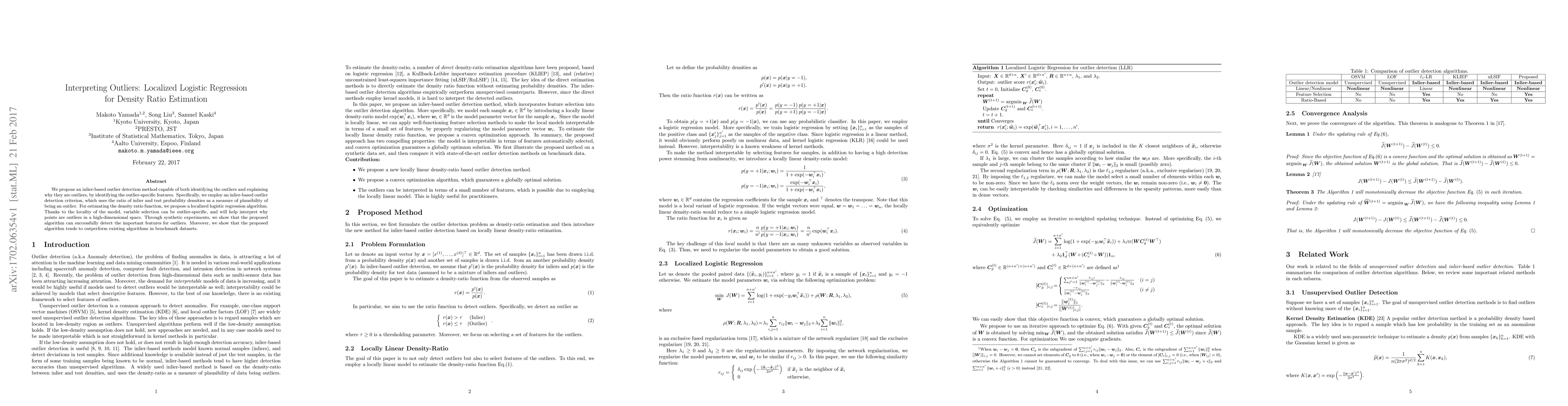 This paper proposes an inlier-based method for detecting and explaining outliers using localized logistic regression for density ratio estimation. The method identifies outlier-specific features and outperforms existing algorithms in synthetic and benchmark datasets.