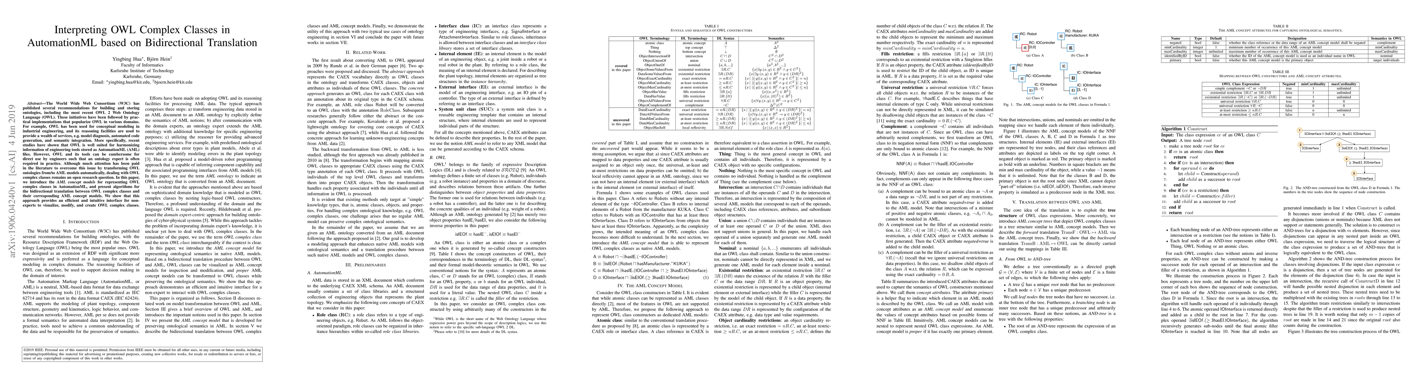 This paper introduces AML concept models for representing OWL complex classes in AutomationML and presents algorithms for bidirectional translation between OWL and AML. This approach aims to provide a user-friendly interface for non-experts to manage OWL complex classes.