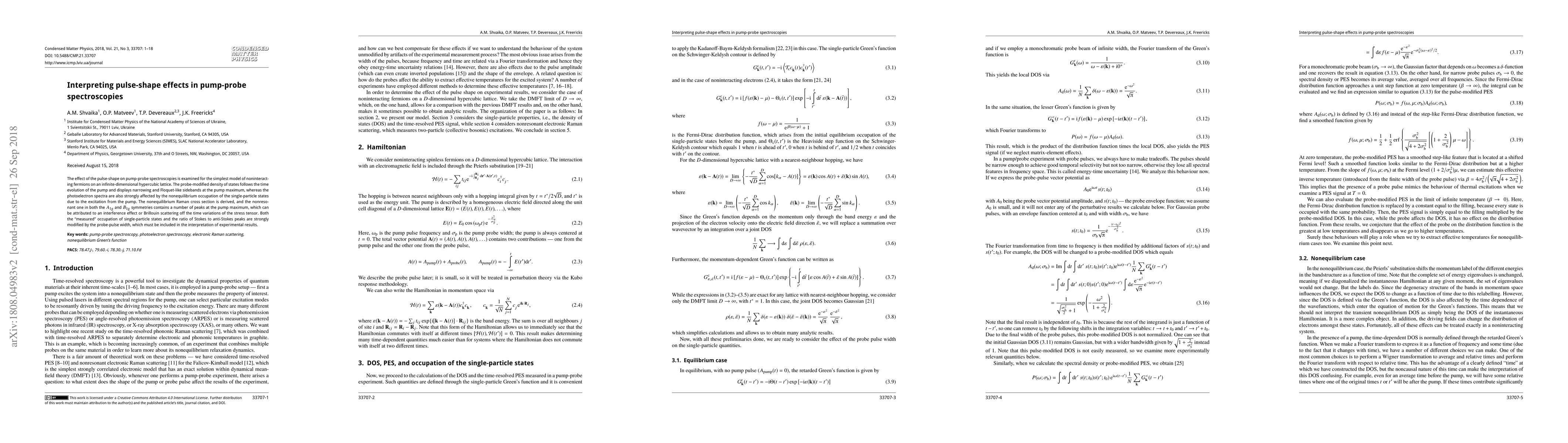 This study investigates how pulse shape affects pump-probe spectroscopies in a hypercubic lattice, finding narrowing and sidebands in probe-modified density of states, as well as modifications to photoelectron spectra and Raman cross sections.