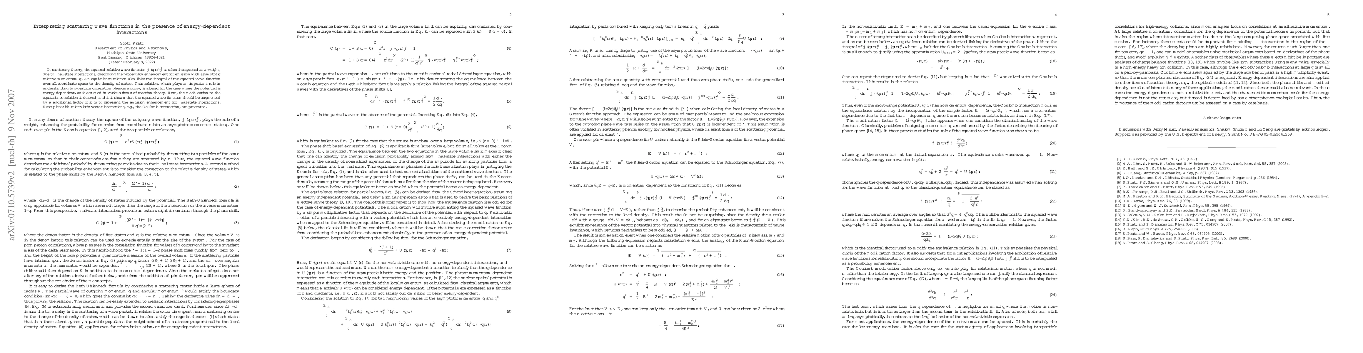 In scattering theory, the squared relative wave function $|\phi({\bf q},{\bf r})|^2$ is often interpreted as a weight, due to final-state interactions, describing the probability enhancement for emission with asymptotic relative momentum $q$. An equivalence relation also links the integral of the squared wave function over all coordinate space to the density of states. This relation, which plays an important role in understanding two-particle correlation phenomenology, is altered for the case where the potential is energy dependent, as is assumed in various forms of reaction theory. Here, the modification to the equivalence relation is derived, and it is shown that the squared wave function should be augmented by a additional factor if it is to represent the emission enhancement for final-state interactions. Examples with relativistic vector interactions, e.g., the Coulomb interaction, are presented.