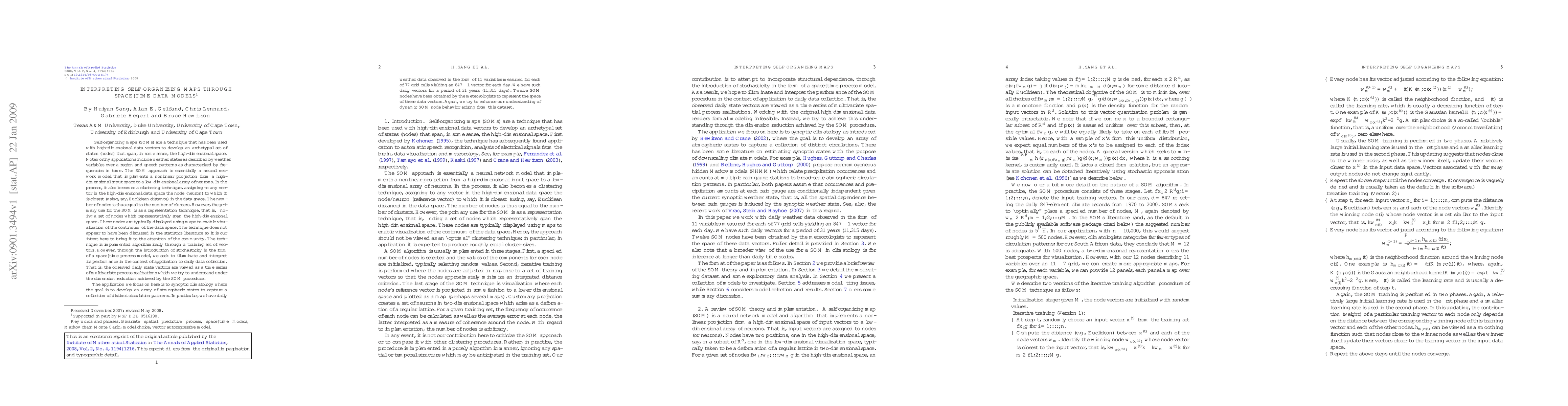 Self-organizing maps (SOMs) are a technique that has been used with high-dimensional data vectors to develop an archetypal set of states (nodes) that span, in some sense, the high-dimensional space. Noteworthy applications include weather states as described by weather variables over a region and speech patterns as characterized by frequencies in time. The SOM approach is essentially a neural network model that implements a nonlinear projection from a high-dimensional input space to a low-dimensional array of neurons. In the process, it also becomes a clustering technique, assigning to any vector in the high-dimensional data space the node (neuron) to which it is closest (using, say, Euclidean distance) in the data space. The number of nodes is thus equal to the number of clusters. However, the primary use for the SOM is as a representation technique, that is, finding a set of nodes which representatively span the high-dimensional space. These nodes are typically displayed using maps to enable visualization of the continuum of the data space. The technique does not appear to have been discussed in the statistics literature so it is our intent here to bring it to the attention of the community. The technique is implemented algorithmically through a training set of vectors. However, through the introduction of stochasticity in the form of a space--time process model, we seek to illuminate and interpret its performance in the context of application to daily data collection. That is, the observed daily state vectors are viewed as a time series of multivariate process realizations which we try to understand under the dimension reduction achieved by the SOM procedure.