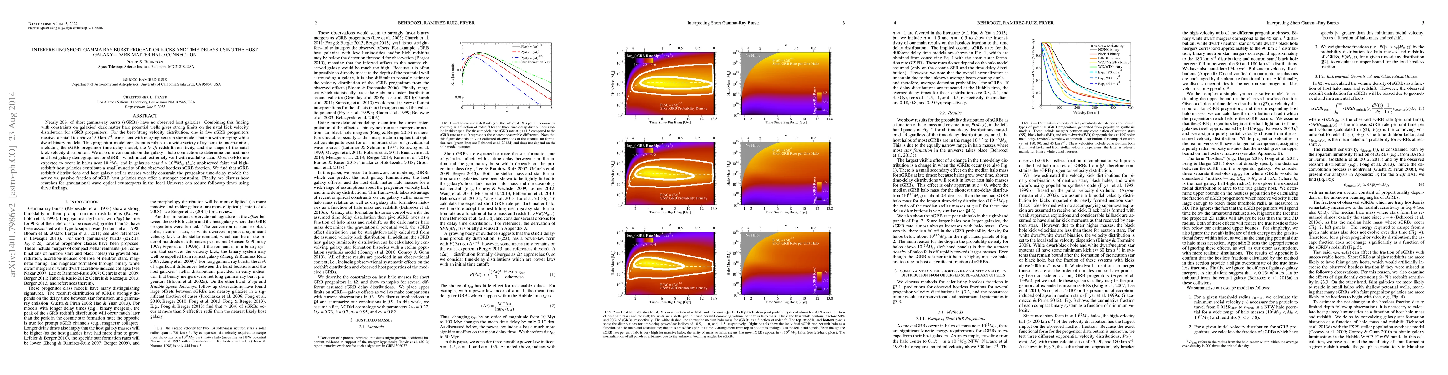 Nearly 20% of short gamma-ray bursts (sGRBs) have no observed host galaxies. Combining this finding with constraints on galaxies' dark matter halo potential wells gives strong limits on the natal kick velocity distribution for sGRB progenitors. For the best-fitting velocity distribution, one in five sGRB progenitors receives a natal kick above 150 km/s, consistent with merging neutron star models but not with merging white dwarf binary models. This progenitor model constraint is robust to a wide variety of systematic uncertainties, including the sGRB progenitor time-delay model, the Swift redshift sensitivity, and the shape of the natal kick velocity distribution. We also use constraints on the galaxy-halo connection to determine the host halo and host galaxy demographics for sGRBs, which match extremely well with available data. Most sGRBs are expected to occur in halos near 10^12 Msun and in galaxies near 5x10^10 Msun (L_*); unobserved faint and high-redshift host galaxies contribute a small minority of the observed hostless sGRB fraction. We find that sGRB redshift distributions and host galaxy stellar masses weakly constrain the progenitor time-delay model; the active vs. passive fraction of sGRB host galaxies may offer a stronger constraint. Finally, we discuss how searches for gravitational wave optical counterparts in the local Universe can reduce followup times using these findings.
