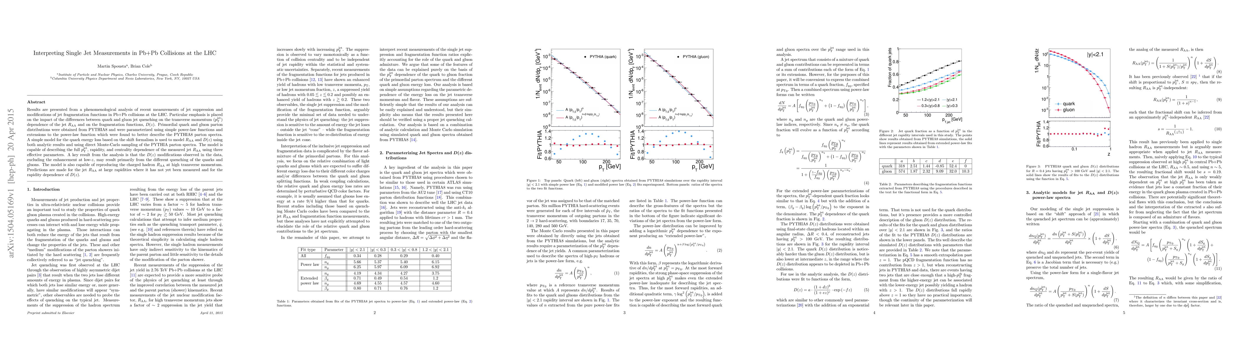 Results are presented from a phenomenological analysis of recent measurements of jet suppression and modifications of jet fragmentation functions in Pb+Pb collisions at the LHC. Particular emphasis is placed on the impact of the differences between quark and gluon jet quenching on the transverse momentum ($p_{T}^{jet}$) dependence of the jet $R_{AA}$ and on the fragmentation functions, $D(z)$. Primordial quark and gluon parton distributions were obtained from PYTHIA8 and were parameterized using simple power-law functions and extensions to the power-law function which were found to better describe the PYTHIA8 parton spectra. A simple model for the quark energy loss based on the shift formalism is used to model $R_{AA}$ and $D(z)$ using both analytic results and using direct Monte-Carlo sampling of the PYTHIA parton spectra. The model is capable of describing the full $p_{T}^{jet}$ , rapidity, and centrality dependence of the measured jet $R_{AA}$ using three effective parameters. A key result from the analysis is that the $D(z)$ modifications observed in the data, excluding the enhancement at low-$z$, may result primarily from the different quenching of the quarks and gluons. The model is also capable of reproducing the charged hadron $R_{AA}$ at high transverse momentum. Predictions are made for the jet $R_{AA}$ at large rapidities where it has not yet been measured and for the rapidity dependence of $D(z)$.