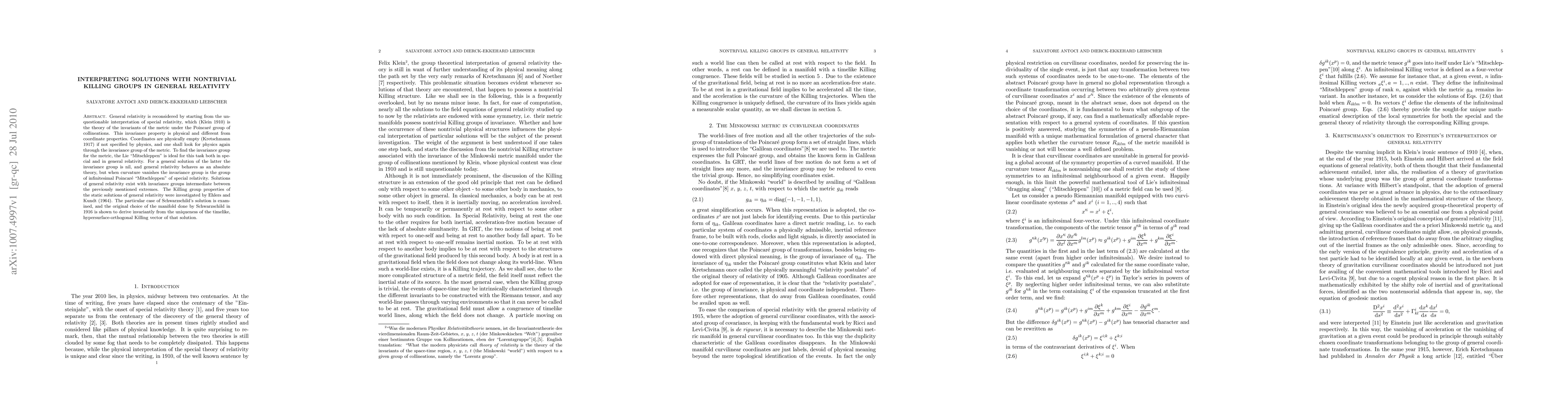 This paper investigates the invariance properties of solutions in general relativity, particularly focusing on nontrivial Killing groups. It begins with the invariant interpretation of special relativity under the Poincaré group, arguing that physics should be sought through the invariance group of the metric rather than arbitrary coordinates. The analysis reveals that static solutions of general relativity exhibit Killing group properties intermediate between the extreme cases of nil and Poincaré invariance, with the Schwarzschild solution exemplifying this through its unique timelike, hypersurface orthogonal Killing vector.
