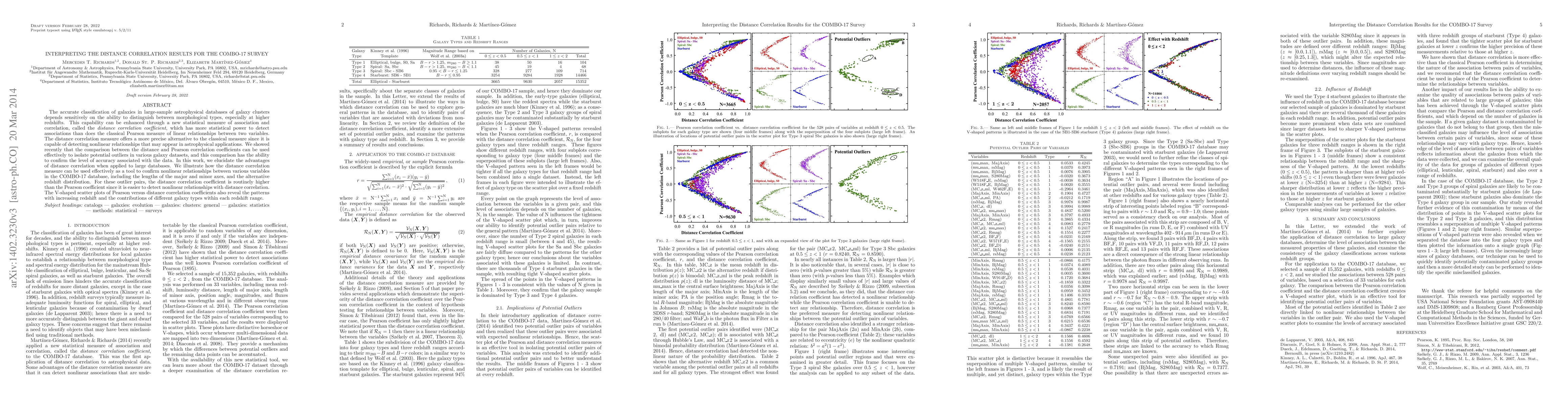 The accurate classification of galaxies in large-sample astrophysical databases of galaxy clusters depends sensitively on the ability to distinguish between morphological types, especially at higher redshifts. This capability can be enhanced through a new statistical measure of association and correlation, called the {\it distance correlation coefficient}, which has more statistical power to detect associations than does the classical Pearson measure of linear relationships between two variables. The distance correlation measure offers a more precise alternative to the classical measure since it is capable of detecting nonlinear relationships that may appear in astrophysical applications. We showed recently that the comparison between the distance and Pearson correlation coefficients can be used effectively to isolate potential outliers in various galaxy datasets, and this comparison has the ability to confirm the level of accuracy associated with the data. In this work, we elucidate the advantages of distance correlation when applied to large databases. We illustrate how the distance correlation measure can be used effectively as a tool to confirm nonlinear relationships between various variables in the COMBO-17 database, including the lengths of the major and minor axes, and the alternative redshift distribution. For these outlier pairs, the distance correlation coefficient is routinely higher than the Pearson coefficient since it is easier to detect nonlinear relationships with distance correlation. The V-shaped scatterplots of Pearson versus distance correlation coefficients also reveal the patterns with increasing redshift and the contributions of different galaxy types within each redshift range.
