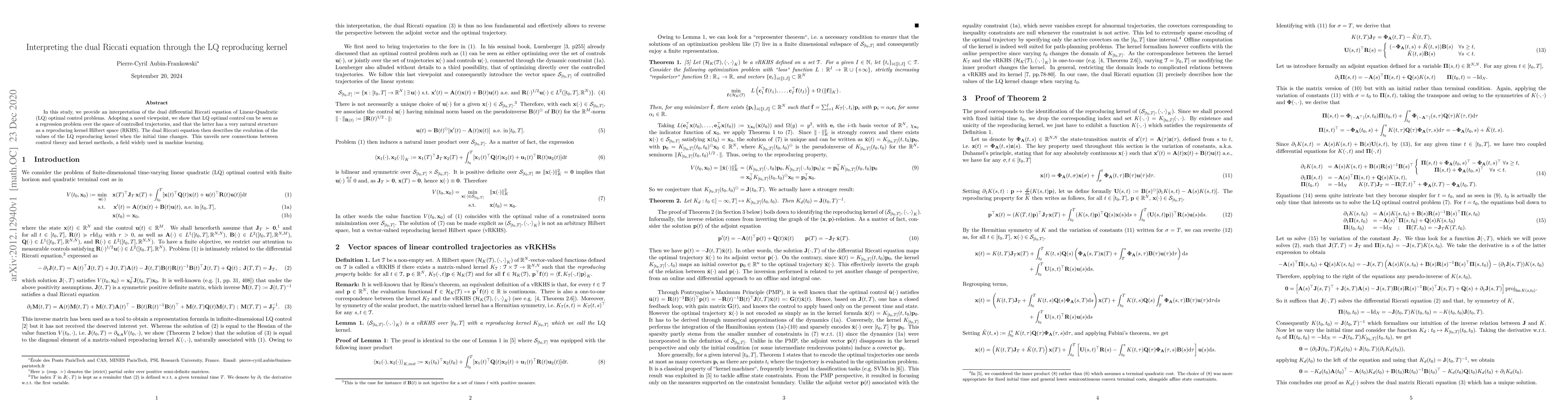 This paper interprets the dual differential Riccati equation in Linear-Quadratic optimal control through the lens of LQ reproducing kernel, revealing it as a regression problem in a reproducing kernel Hilbert space, thus establishing new links between control theory and kernel methods.