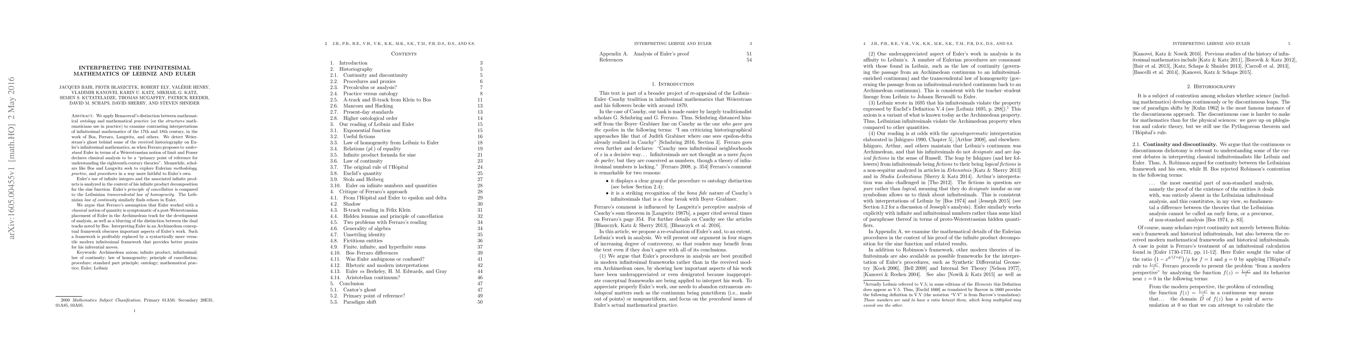 We apply Benacerraf's distinction between mathematical ontology and mathematical practice (or the structures mathematicians use in practice) to examine contrasting interpretations of infinitesimal mathematics of the 17th and 18th century, in the work of Bos, Ferraro, Laugwitz, and others. We detect Weierstrass's ghost behind some of the received historiography on Euler's infinitesimal mathematics, as when Ferraro proposes to understand Euler in terms of a Weierstrassian notion of limit and Fraser declares classical analysis to be a "primary point of reference for understanding the eighteenth-century theories." Meanwhile, scholars like Bos and Laugwitz seek to explore Eulerian methodology, practice, and procedures in a way more faithful to Euler's own. Euler's use of infinite integers and the associated infinite products is analyzed in the context of his infinite product decomposition for the sine function. Euler's principle of cancellation is compared to the Leibnizian transcendental law of homogeneity. The Leibnizian law of continuity similarly finds echoes in Euler. We argue that Ferraro's assumption that Euler worked with a classical notion of quantity is symptomatic of a post-Weierstrassian placement of Euler in the Archimedean track for the development of analysis, as well as a blurring of the distinction between the dual tracks noted by Bos. Interpreting Euler in an Archimedean conceptual framework obscures important aspects of Euler's work. Such a framework is profitably replaced by a syntactically more versatile modern infinitesimal framework that provides better proxies for his inferential moves. Keywords: Archimedean axiom; infinite product; infinitesimal; law of continuity; law of homogeneity; principle of cancellation; procedure; standard part principle; ontology; mathematical practice; Euler; Leibniz