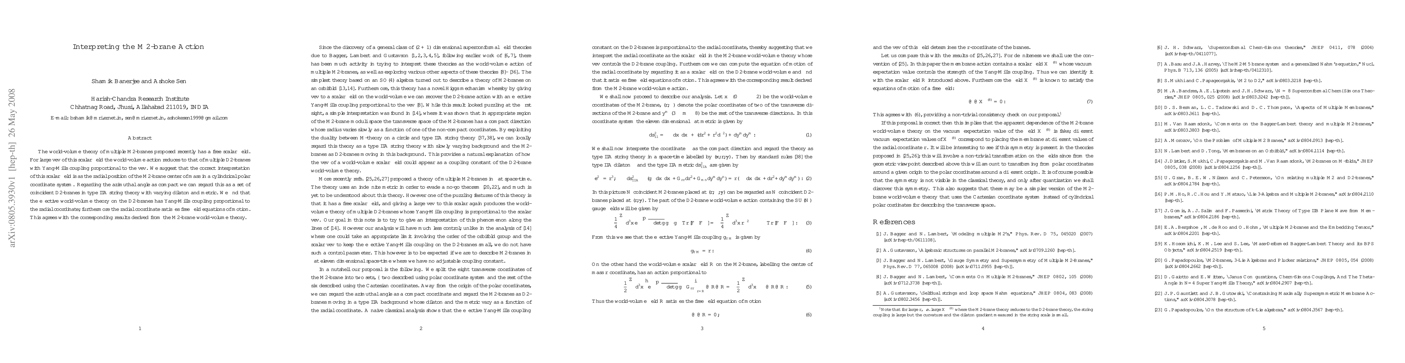 The paper interprets the world-volume action of M2-branes, showing it reduces to D2-branes' action when the scalar field's vev is large. The scalar field is identified as the radial position of the M2-brane center of mass, leading to an effective theory on D2-branes with Yang-Mills coupling proportional to the radial coordinate.