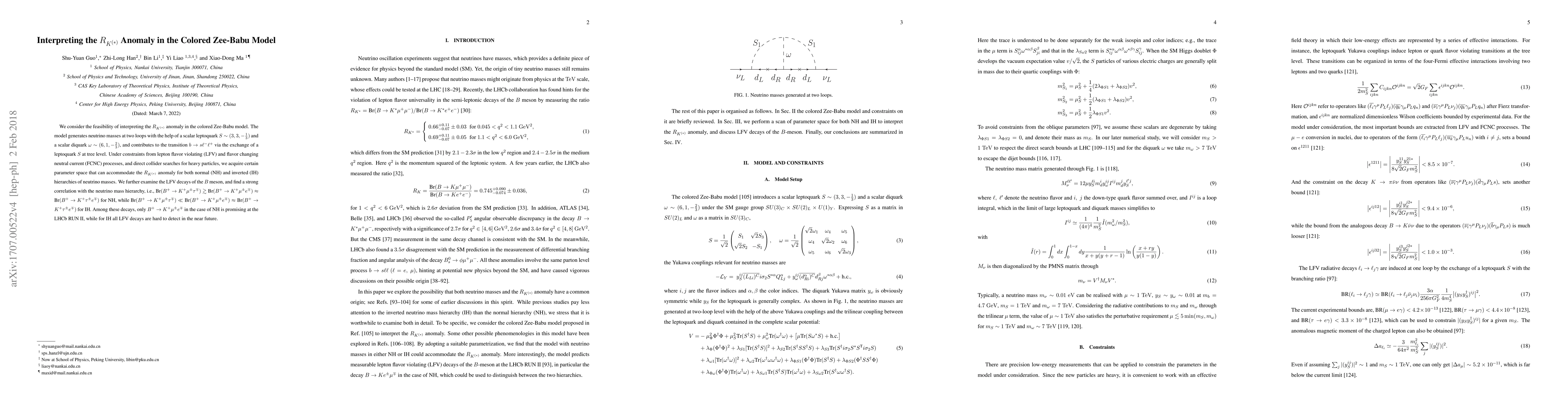 We consider the feasibility of interpreting the $R_{K^{(*)}}$ anomaly in the colored Zee-Babu model. The model generates neutrino masses at two loops with the help of a scalar leptoquark $S\sim(3,3,-\frac{1}{3})$ and a scalar diquark $\omega\sim(6,1,-\frac{2}{3})$, and contributes to the transition $b\to s\ell\ell$ via the exchange of a leptoquark $S$ at tree level. Under constraints from lepton flavor violating (LFV) and flavor changing neutral current (FCNC) processes, and direct collider searches for heavy particles, we acquire certain parameter space that can accommodate the $R_{K^{(*)}}$ anomaly for both normal (NH) and inverted (IH) hierarchies of neutrino masses. We further examine the LFV decays of the $B$ meson, and find its strong correlation with the neutrino mass hierarchy, i.e., $\text{Br}(B^+ \to K^+ \mu^\pm\tau^\mp)\gtrsim\text{Br}(B^+ \to K^+ \mu^\pm e^\mp)\approx\text{Br}(B^+ \to K^+ \tau^\pm e^\mp)$ for NH, while $\text{Br}(B^+ \to K^+ \mu^\pm \tau^\mp)\ll\text{Br}(B^+ \to K^+ \mu^\pm e^\mp)\approx\text{Br}(B^+ \to K^+ \tau^\pm e^\mp)$ for IH. Among these decays, only $B^+ \to K^+ \mu^\pm e^\mp$ in the case of NH is promising at the LHCb RUN II, while for IH all LFV decays are hard to detect in the near future.