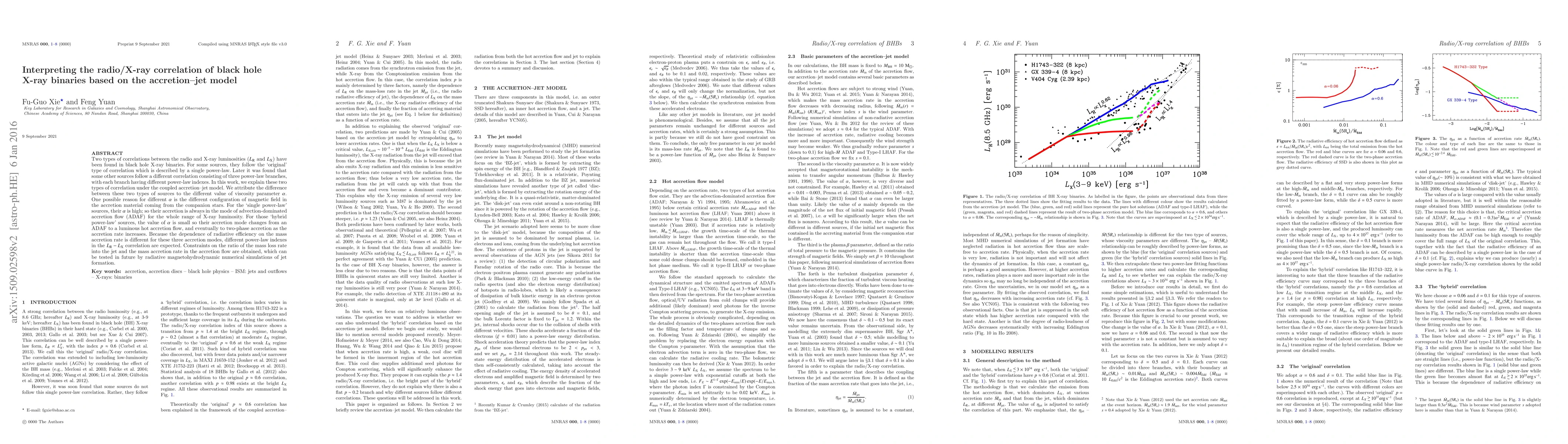 This paper explains the differing radio/X-ray luminosity correlations in black hole X-ray binaries using an accretion-jet model, attributing the variations to the viscosity parameter $\alpha$ and magnetic field configuration. It proposes that high $\alpha$ leads to a single power-law correlation via advection-dominated accretion, while low $\alpha$ results in a hybrid power-law correlation through varying accretion modes.