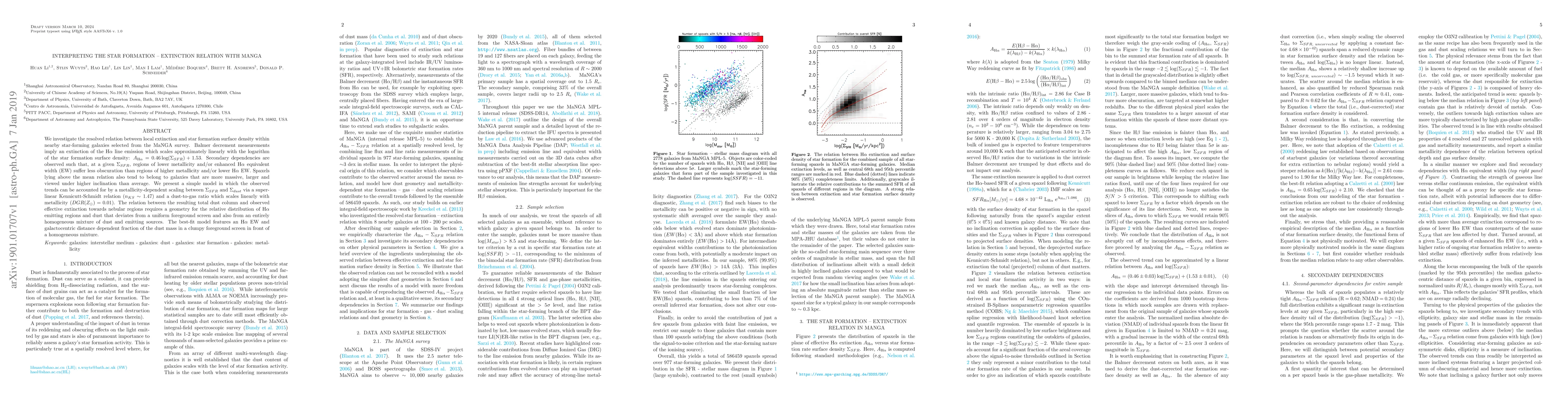 This paper explores the correlation between local extinction and star formation surface density in nearby star-forming galaxies from the MaNGA survey. It finds a linear scaling between extinction of Hα emission and star formation density, with secondary dependencies influenced by metallicity and Hα emission characteristics.