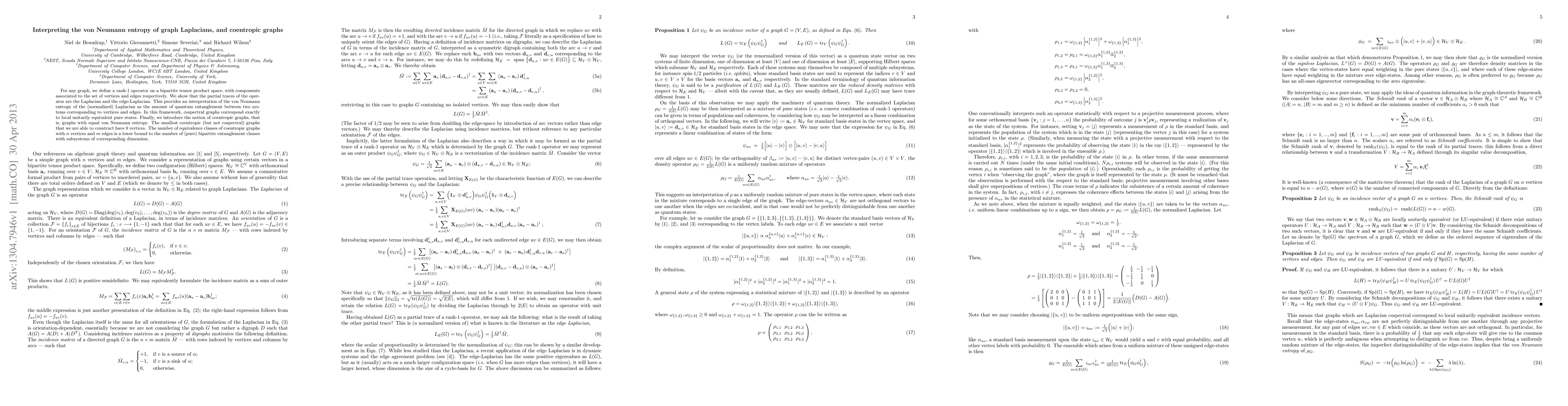 Research finds that the von Neumann entropy of graph Laplacians can be used to measure quantum entanglement between vertices and edges in graphs, with cospectral graphs corresponding to locally equivalent pure states. The study also introduces coentropic graphs as those with equal von Neumann entropy, providing a new framework for understanding bipartite entanglement.