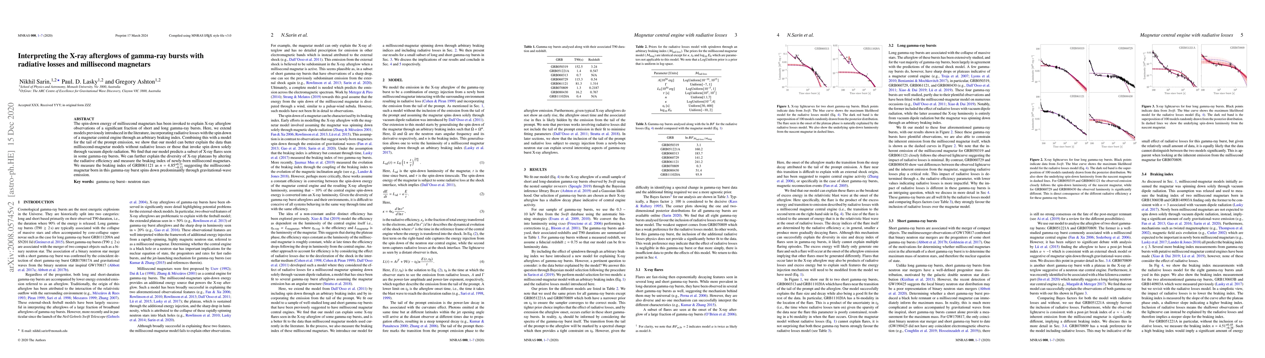 The spin-down energy of millisecond magnetars has been invoked to explain X-ray afterglow observations of a significant fraction of short and long gamma-ray bursts. Here, we extend models previously introduced in the literature, incorporating radiative losses with the spin down of a magnetar central engine through an arbitrary braking index. Combining this with a model for the tail of the prompt emission, we show that our model can better explain the data than millisecond-magnetar models without radiative losses or those that invoke spin down solely through vacuum dipole radiation. We find that our model predicts a subset of X-ray flares seen in some gamma-ray bursts. We can further explain the diversity of X-ray plateaus by altering the radiative efficiency and measure the braking index of newly-born millisecond magnetars. We measure the braking index of GRB061121 as $n=4.85^{+0.11}_{-0.15}$ suggesting the millisecond-magnetar born in this gamma-ray burst spins down predominantly through gravitational-wave emission.