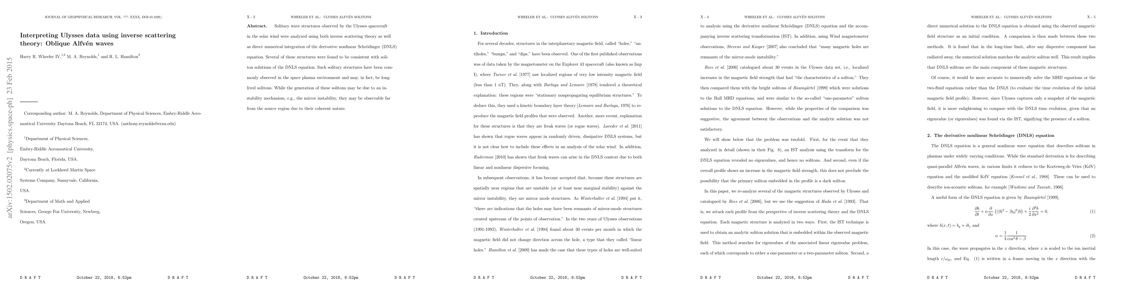 Solitary wave structures observed by the Ulysses spacecraft in the solar wind were analyzed using both inverse scattering theory as well as direct numerical integration of the derivative nonlinear Schr\"odinger (DNLS) equation. Several of these structures were found to be consistent with soliton solutions of the DNLS equation. Such solitary structures have been commonly observed in the space plasma environment and may, in fact, be long-lived solitons. While the generation of these solitons may be due to an instability mechanism, e.g., the mirror instability, they may be observable far from the source region due to their coherent nature.