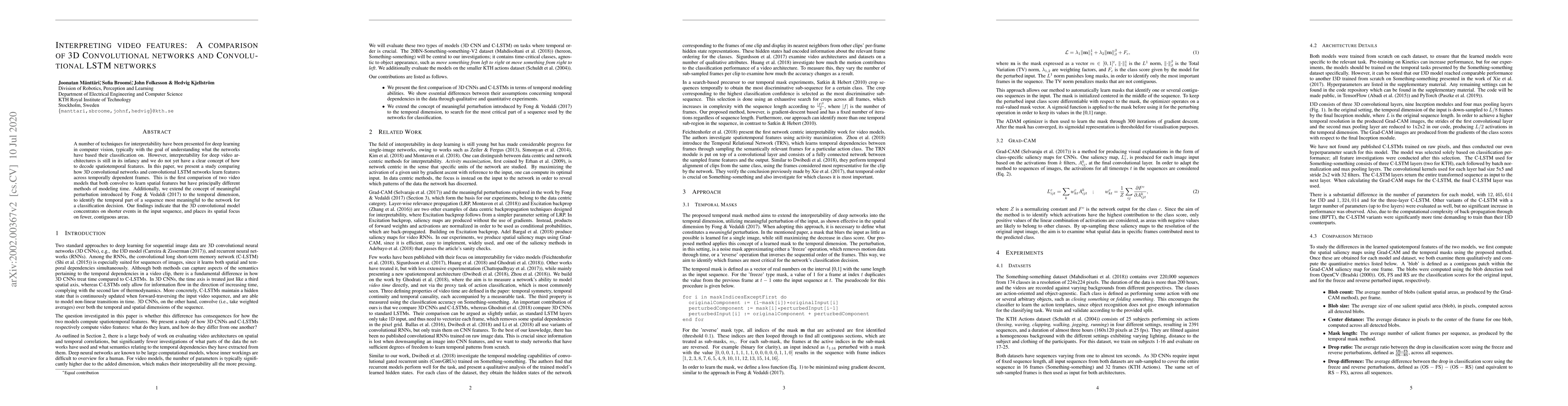 This paper compares 3D convolutional networks and convolutional LSTM networks for interpreting spatiotemporal features in video data, revealing that the 3D model focuses on shorter events and contiguous spatial areas, while the LSTM model captures longer temporal dependencies.