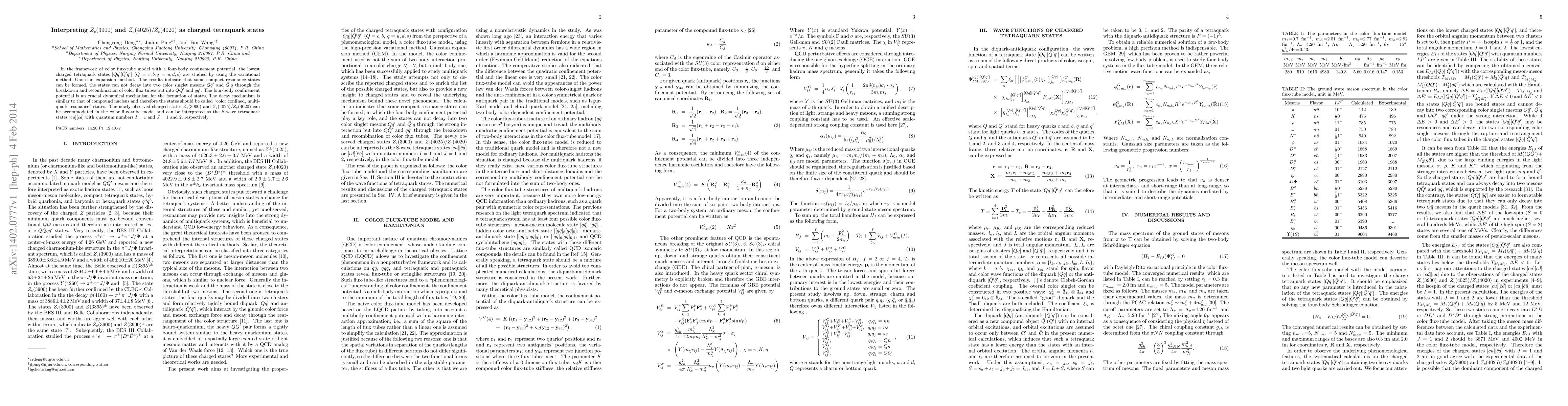 This paper uses the color flux-tube model and four-body confinement potential to study charged tetraquark states, finding that $Z_c(3900)$ and $Z_c(4025)/Z_c(4020)$ can be interpreted as $S$-wave tetraquark states $[cu][\bar{c}\bar{d}]$ with quantum numbers $I=1$ and $J=1$ and $2$, respectively. The decay mechanism is akin to that of a compound nucleus.