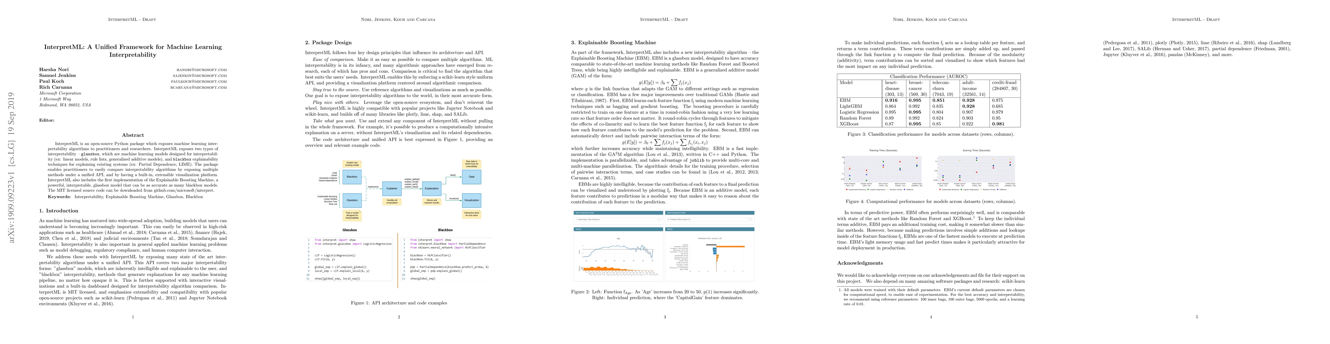 InterpretML is an open-source Python package which exposes machine learning interpretability algorithms to practitioners and researchers. InterpretML exposes two types of interpretability - glassbox models, which are machine learning models designed for interpretability (ex: linear models, rule lists, generalized additive models), and blackbox explainability techniques for explaining existing systems (ex: Partial Dependence, LIME). The package enables practitioners to easily compare interpretability algorithms by exposing multiple methods under a unified API, and by having a built-in, extensible visualization platform. InterpretML also includes the first implementation of the Explainable Boosting Machine, a powerful, interpretable, glassbox model that can be as accurate as many blackbox models. The MIT licensed source code can be downloaded from github.com/microsoft/interpret.