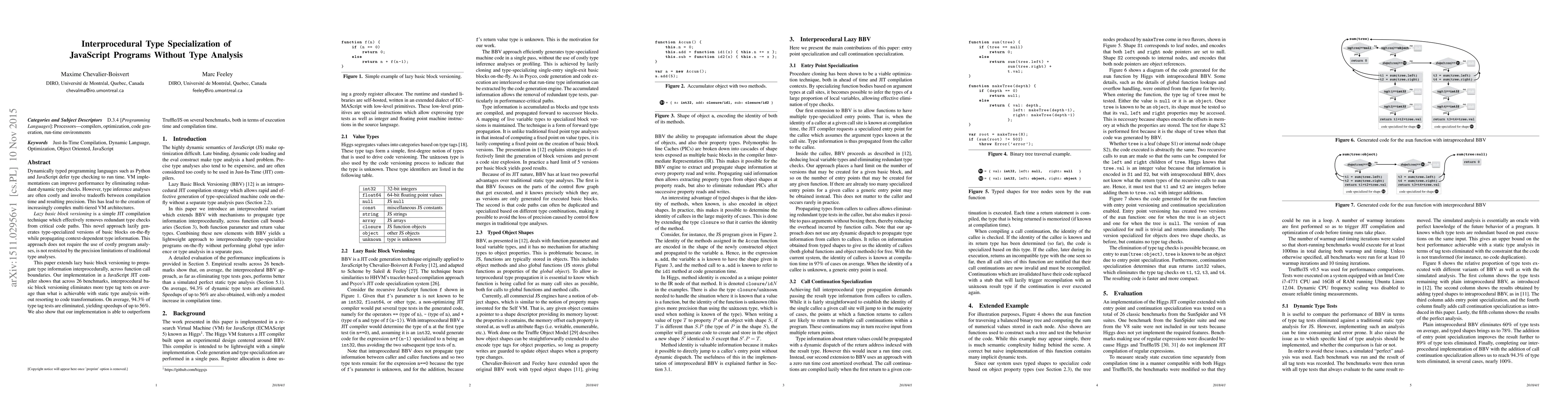 This paper proposes interprocedural type specialization for JavaScript programs using lazy basic block versioning, eliminating redundant type checks without costly type inference analyses. The approach achieves up to 94.3% reduction in type tag tests and speedups of up to 56%, outperforming Truffle/JS in execution and compilation times.
