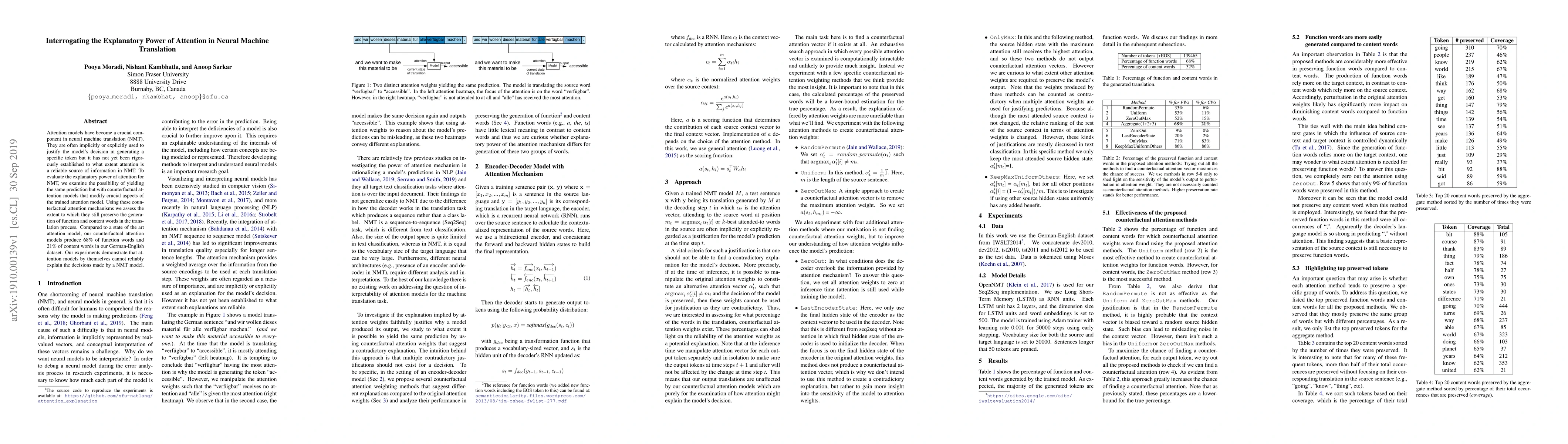 This paper investigates the explanatory power of attention mechanisms in neural machine translation (NMT), finding that counterfactual attention models significantly alter the generation of function and content words, indicating that attention alone cannot reliably explain NMT decisions. The study concludes that attention models do not sufficiently justify the model's translation choices.