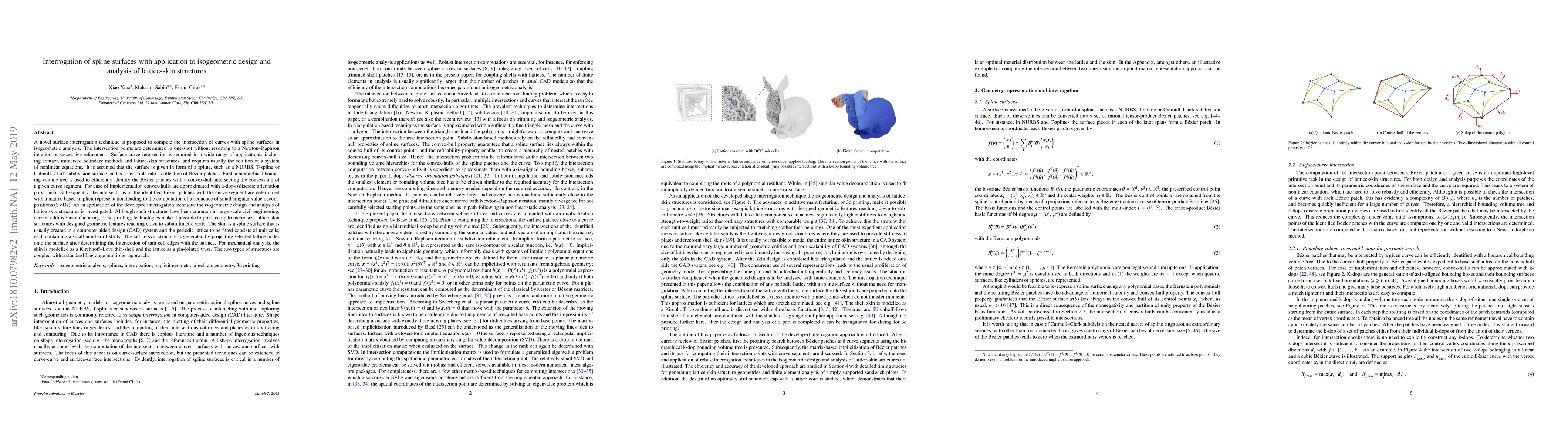 A novel surface interrogation technique is proposed to compute the intersection of curves with spline surfaces in isogeometric analysis. The intersection points are determined in one-shot without resorting to a Newton-Raphson iteration or successive refinement. Surface-curve intersection is required in a wide range of applications, including contact, immersed boundary methods and lattice-skin structures, and requires usually the solution of a system of nonlinear equations. It is assumed that the surface is given in form of a spline, such as a NURBS, T-spline or Catmull-Clark subdivision surface, and is convertible into a collection of B\'ezier patches. First, a hierarchical bounding volume tree is used to efficiently identify the B\'ezier patches with a convex-hull intersecting the convex-hull of a given curve segment. For ease of implementation convex-hulls are approximated with k-dops (discrete orientation polytopes). Subsequently, the intersections of the identified B\'ezier patches with the curve segment are determined with a matrix-based implicit representation leading to the computation of a sequence of small singular value decompositions (SVDs). As an application of the developed interrogation technique the isogeometric design and analysis of lattice-skin structures is investigated. The skin is a spline surface that is usually created in a computer-aided design (CAD) system and the periodic lattice to be fitted consists of unit cells, each containing a small number of struts. The lattice-skin structure is generated by projecting selected lattice nodes onto the surface after determining the intersection of unit cell edges with the surface. For mechanical analysis, the skin is modelled as a Kirchhoff-Love thin-shell and the lattice as a pin-jointed truss. The two types of structures are coupled with a standard Lagrange multiplier approach.