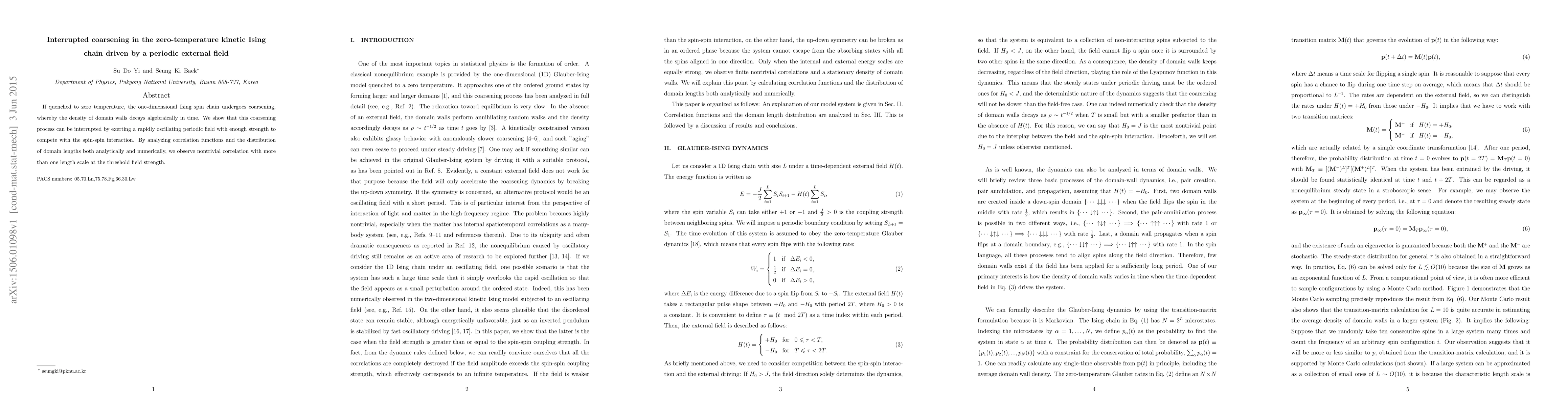 This paper investigates how coarsening in a zero-temperature Ising spin chain can be interrupted by a strong, rapidly oscillating external field, revealing complex correlation functions and multi-scale domain length distributions at the threshold field strength. Analytical and numerical methods confirm these findings.