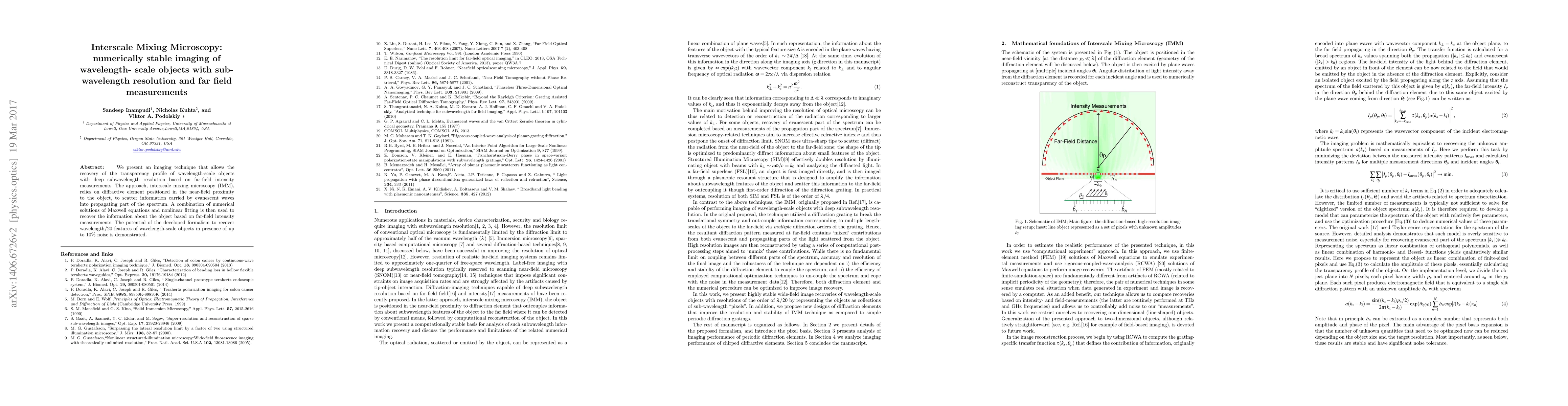 Interscale Mixing Microscopy (IMM) enables high-resolution imaging of wavelength-scale objects using far-field intensity measurements and diffractive elements to capture evanescent wave information. The technique combines numerical solutions of Maxwell equations and nonlinear fitting to achieve sub-wavelength resolution despite up to 10% noise.