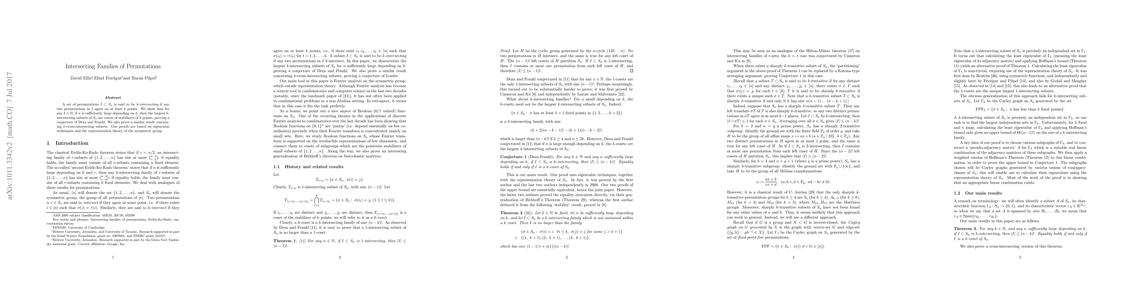 A set of permutations $I \subset S_n$ is said to be {\em k-intersecting} if any two permutations in $I$ agree on at least $k$ points. We show that for any $k \in \mathbb{N}$, if $n$ is sufficiently large depending on $k$, then the largest $k$-intersecting subsets of $S_n$ are cosets of stabilizers of $k$ points, proving a conjecture of Deza and Frankl. We also prove a similar result concerning $k$-cross-intersecting subsets. Our proofs are based on eigenvalue techniques and the representation theory of the symmetric group.