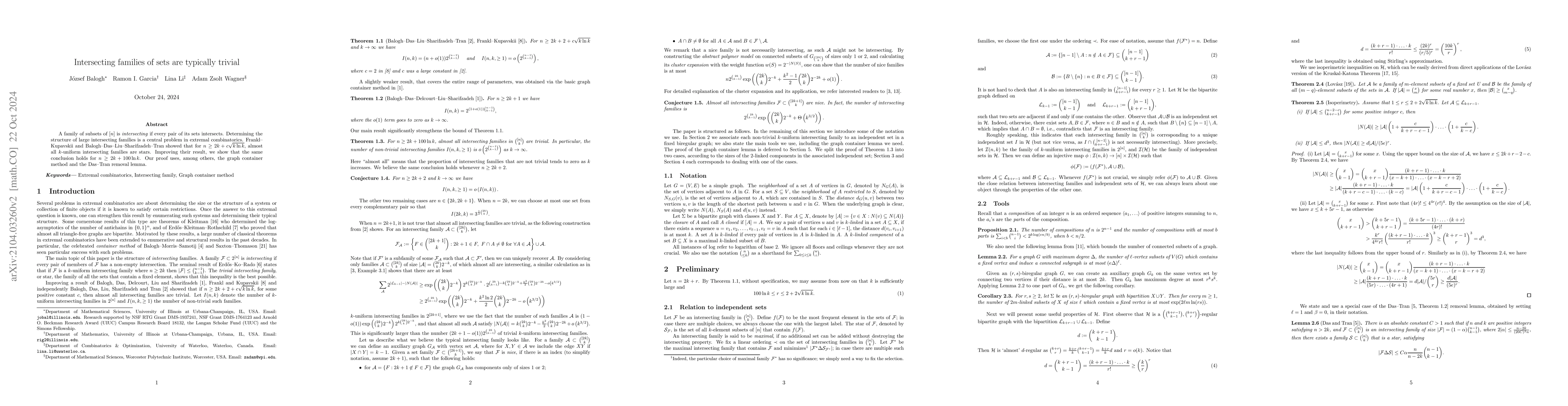 Large intersecting families of subsets in set theory are typically stars for n >= 2k + 100ln(k), according to a recent improvement on an existing result.
